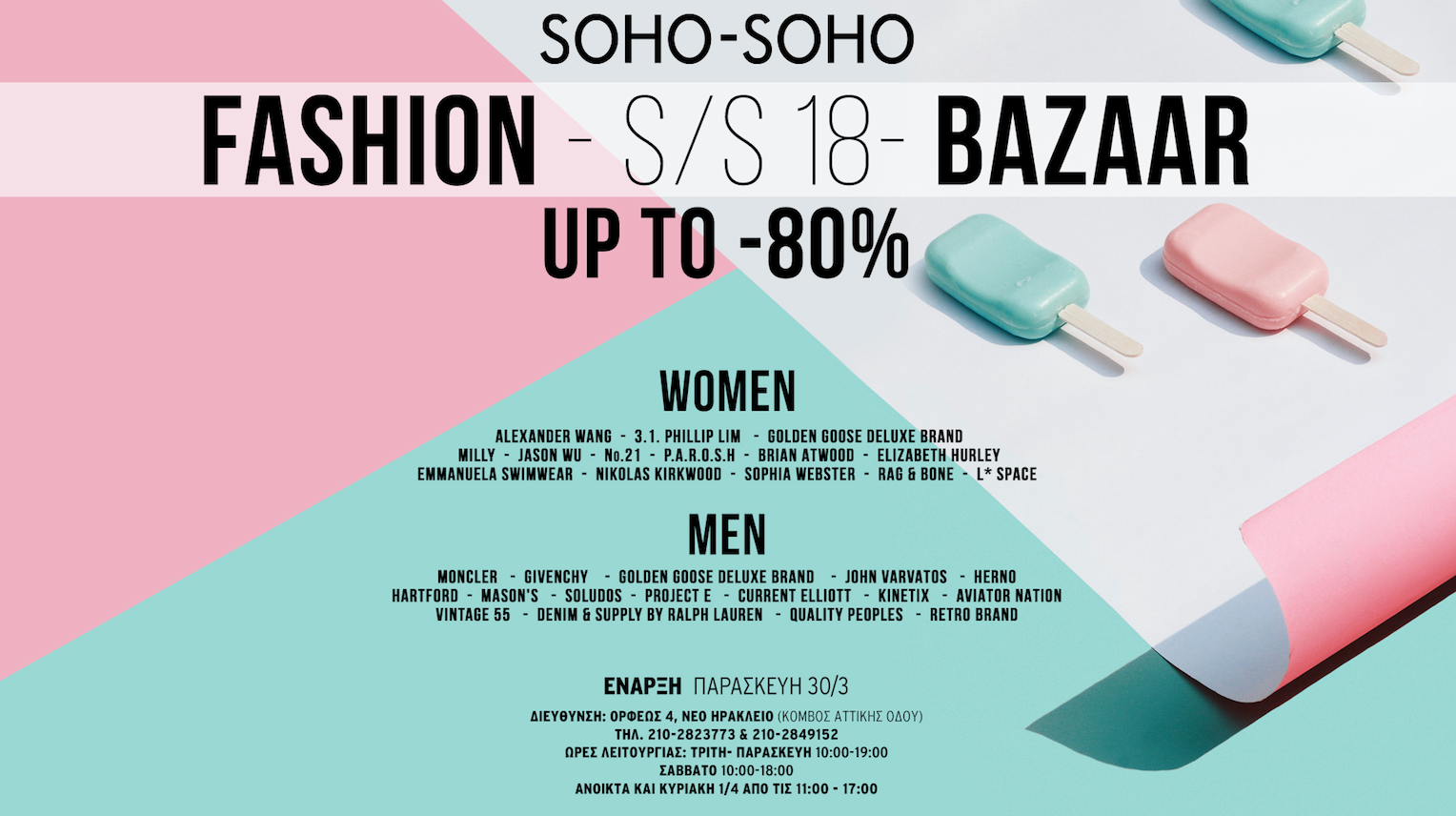 Εδώ λοιπόν μπορεί να μην έχουμε συχνά sample sales των εγχώριων δημιουργών, σίγουρα δεν έχουμε sample sales γνωστών Οίκων, όμως το Soho-Soho διοργανώνει κάθε σεζόν ένα μεγάλο fashion bazaar με εκπτώσεις που φτάνουν το 80% σε designer items που όλοι θέλουμε να αποκτήσουμε. Έτσι και αυτή τη φορά το Fashion Bazaar του Soho-Soho επιστρέφει με καλοκαιρινή δάθεση. Από την Παρασκευή 30 Μαρτίου, οι επισκέπτες του θα έχουν για άλλη μία φορά τη δυνατότητα να ανακαλύψουν μοναδικά ανοιξιάτικα και καλοκαιρινά κομμάτια από αγαπημένα brands όπως Αlexander Wang, Moncler, Givenchy, 3.1. Phillip Lim, Golden Goose Deluxe Brand, John Varvatos, No.21, Jason Wu, Herno, Hartforfd και πολλά άλλα, και όλα με εκπτώσεις που φτάνουν μέχρι και το 80%.
