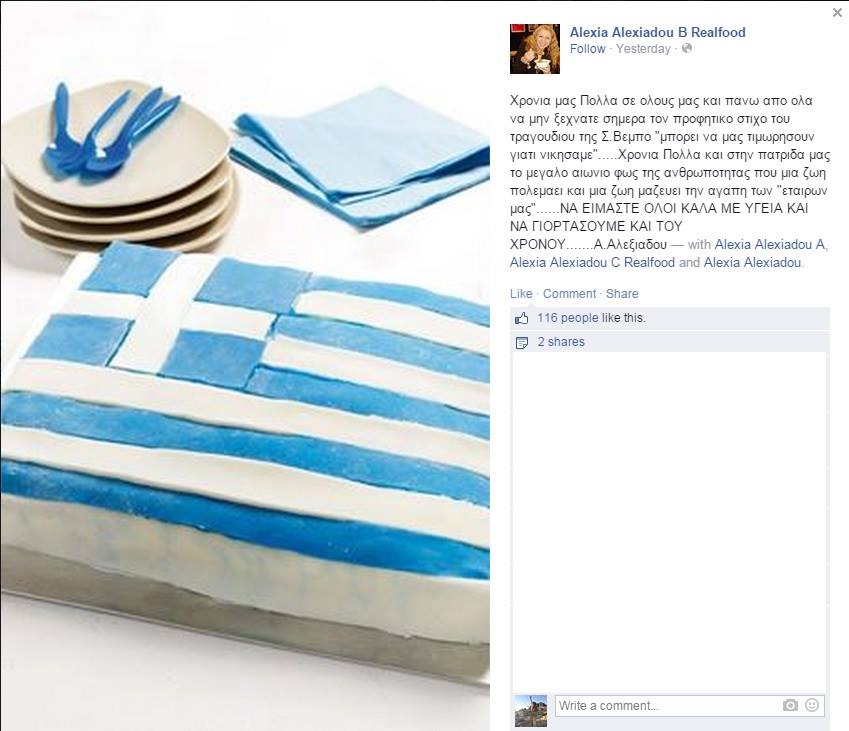«Χρόνια μας Πολλά σε όλους μας και πάνω από όλα να μην ξεχνάτε σήμερα τον προφητικό στίχο του τραγουδιού της Σ. Βέμπο “Μπορεί να μας τιμωρήσουν γιατί νικήσαμε”. Χρόνια Πολλά και στην πατρίδα μας το μεγάλο αιώνιο φως της ανθρωπότητας που μια ζωή πολεμάει και μια ζωή μαζεύει την αγάπη των “εταίρων μας”. Να είμαστε όλοι καλά με υγεία και να γιορτάσουμε και του χρόνου. Α. Αλεξιάδου».