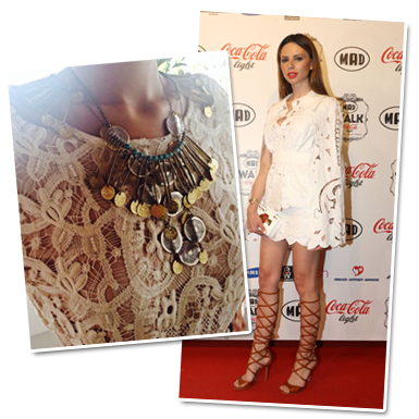 «H φιλία ξεκίνησε πριν ένα χρόνο, τις ανακάλυψα μέσω Instagram και ενθουσιάστηκα. Το πρώτο μου post στο blog/site μου ήταν με δικό τους ρούχο. Εκτιμώ πολύ τη δουλειά τους .Για τα βραβεία του Mad ήθελα μια πιο gypsy εμφάνιση με φλουριά και κεντήματα. Της είπα τις σκέψεις μου κι εκείνη δημιούργησε αυτό το φόρεμα το οποίο είναι custom made όπως και το κόσμημα από το 3rd floor» είπε η παρουσιάστρια για τη συνεργασία της με τα κορίτσια της Nidodileda.