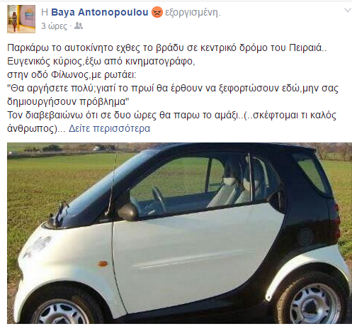 Στην οργισμένη ανάρτηση της στο Facebook, η Μπάγια Αντωνοπούλου περιγράφει το περιστατικό. Σύμφωνα με την περιγραφή της, μόλις είχε παρκάρει σε κεντρικό δρόμο του Πειραιά, όταν ένας άγνωστος την πλησίασε και την ρώτησε πόση ώρα θα έχει εκεί το αμάξι της, με το πρόσχημα ότι την επόμενη ημέρα το πρωί, στο συγκεκριμένο σημείο, θα ξεφορτώσουν πράγματα.
