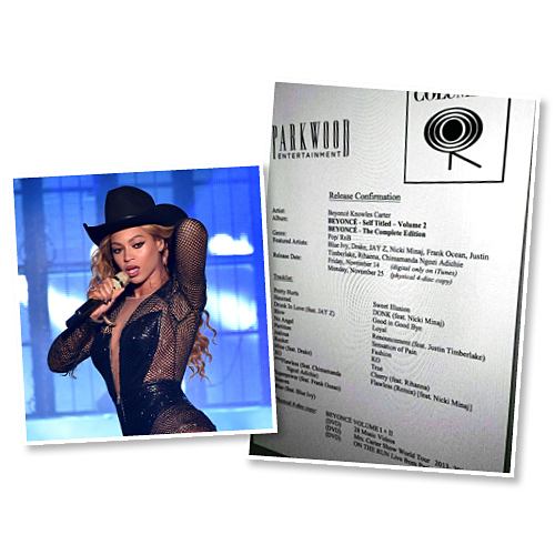 Αυτό τουλάχιστον μαρτυρά ένα έγγραφο που δημοσίευσε το Vulture, το οποίο αναφέρεται στην κυκλοφορία του «Volume 2» στις 14 Νοεμβρίου. Μάλιστα η νέα της δουλειά περιλαμβάνει guest artists όπως οι Rihanna, Nicki Minaj, Drake, Justin Timberlake, Jay Z αλλά και της δίχρονης κόρης της Blue Ivy! Δεν έχουμε παρά να ελπίζουμε να είναι αυθεντικό το έγγραφο.