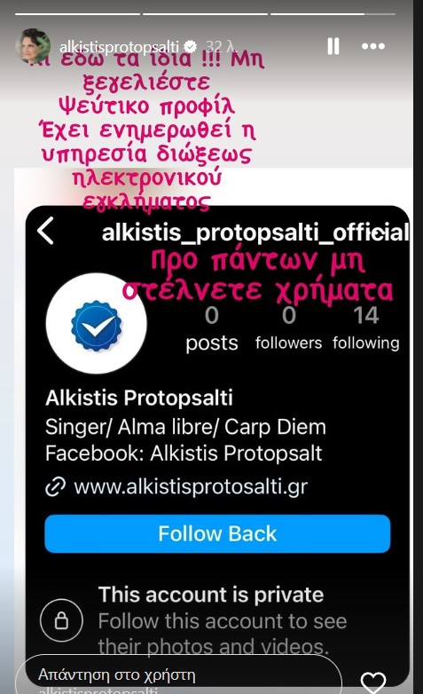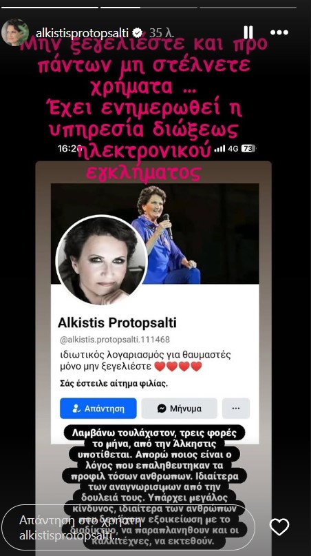 “Μην ξεγελιέστε και προ πάντων μην στέλνετε χρήματα… Έχει ενημερωθεί η Υπηρεσία Διώξεως Ηλεκτρονικού Εγκλήματος”, έγραψε η Άλκηστις Πρωτοψάλτη πάνω στο πρώτο ψεύτικο προφίλ.