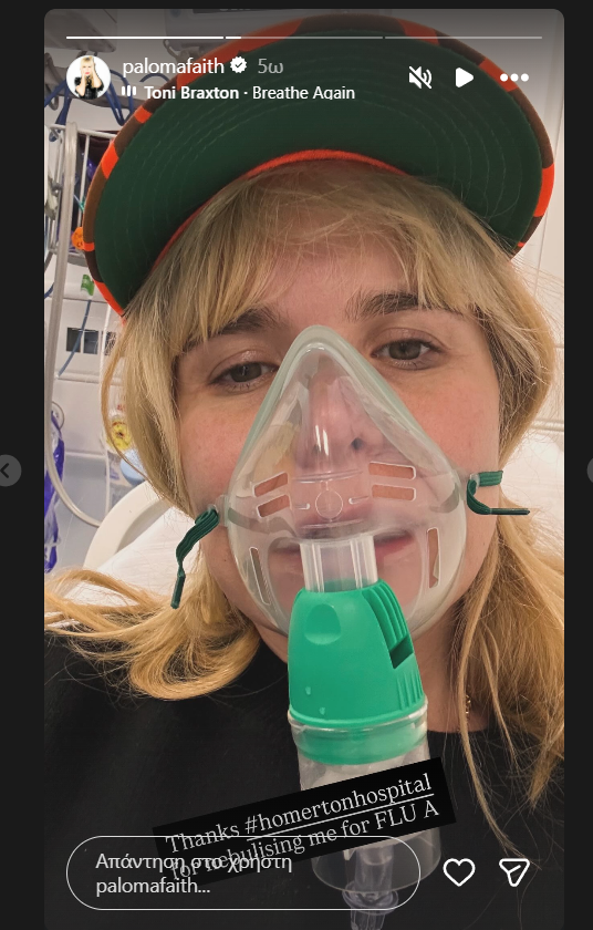 Η Paloma Faith αποκάλυψε ότι νοσηλεύτηκε με γρίπη, καθώς μοιράστηκε μια φωτογραφία της φορώντας νεφελοποιητή για να σταθεροποιήσει την αναπνοή της.