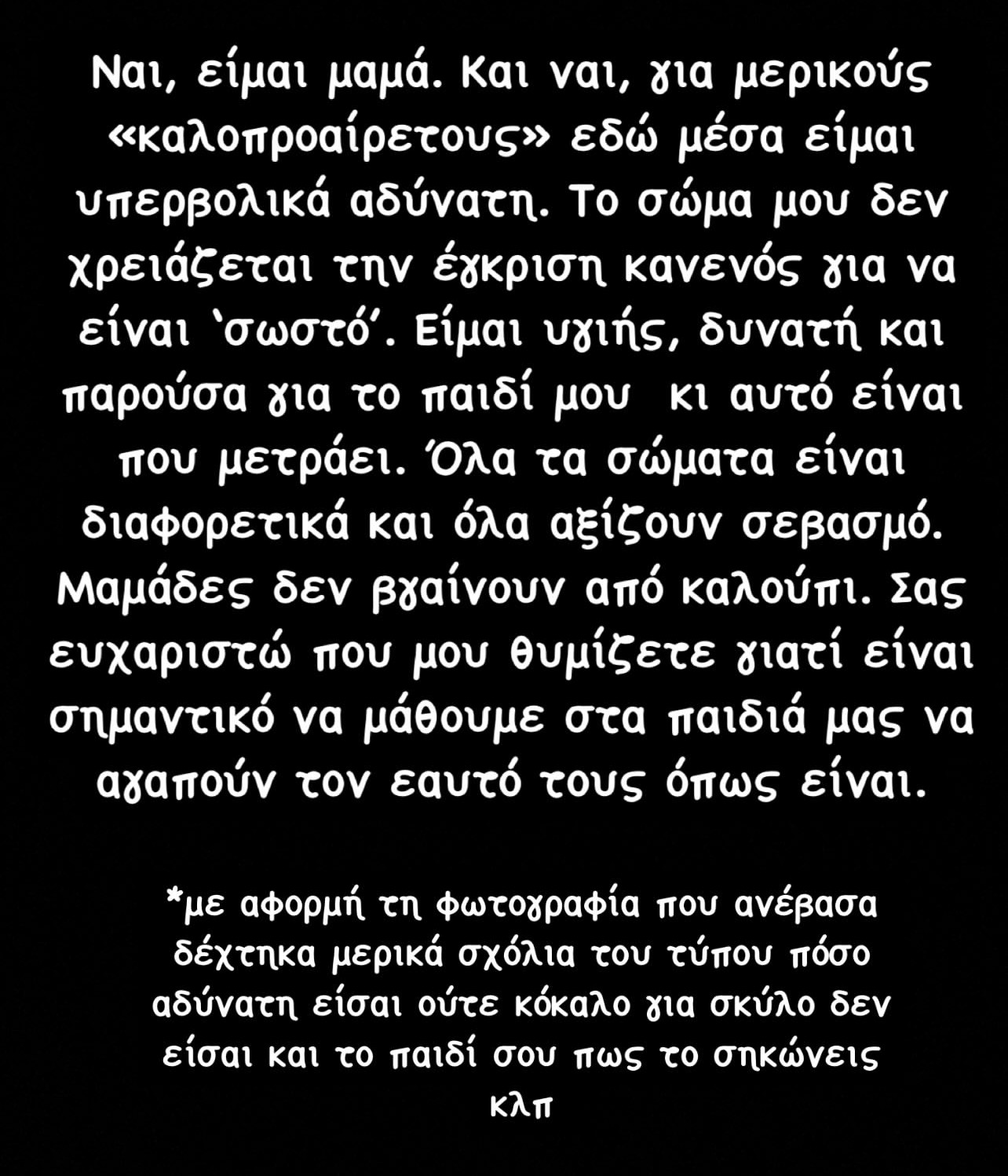 «Ναι, είμαι μαμά. Και ναι, για ορισμένους “καλοπροαίρετους” είμαι υπερβολικά αδύνατη. Το σώμα μου δεν χρειάζεται την έγκριση κανενός για να είναι σωστό. Είμαι υγιής, δυνατή και παρούσα για το παιδί μου κι αυτό είναι που μετράει. Όλα τα σώματα είναι διαφορετικά και όλα αξίζουν σεβασμό. Μαμάδες δεν βγαίνουν από καλούπι. Σας ευχαριστώ που μου θυμίζετε γιατί είναι σημαντικό να μάθουμε στα παιδιά μας να αγαπούν τον εαυτό τους όπως είναι.