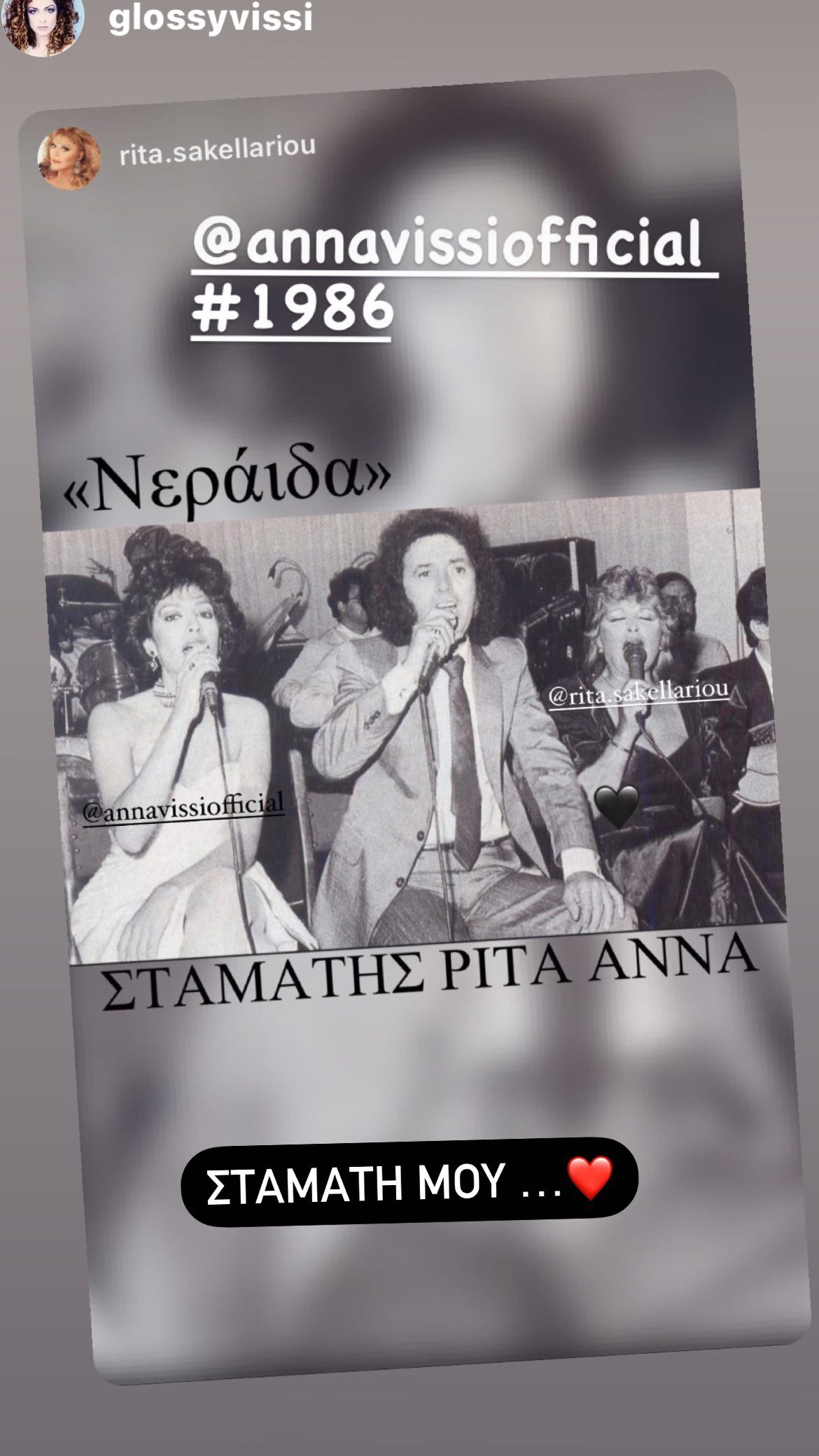 Η Άννα Βίσση ανέβασε δύο φωτογραφίες σε insta story, μία από την κοινή τους εμφάνιση το 1986 στη “Νεράιδα” μαζί με την αξέχαστη Ρίτα Σακελλαρίου και μία από την τελευταία φορά που συναντήθηκαν στο μαγαζί όπου εμφανιζόταν εκείνη.