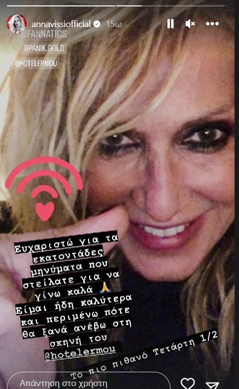 “Ευχαριστώ για τα εκατοντάδες μηνύματα που στείλατε για να γίνω καλά 🙏 Είμαι ήδη καλύτερα και περιμένω πότε θα ξανά ανέβω στη σκηνή. Το πιο πιθανό Τετάρτη 1/2“, έγραψε η Άννα Βίσση στη λεζάντα της ανάρτησής της.