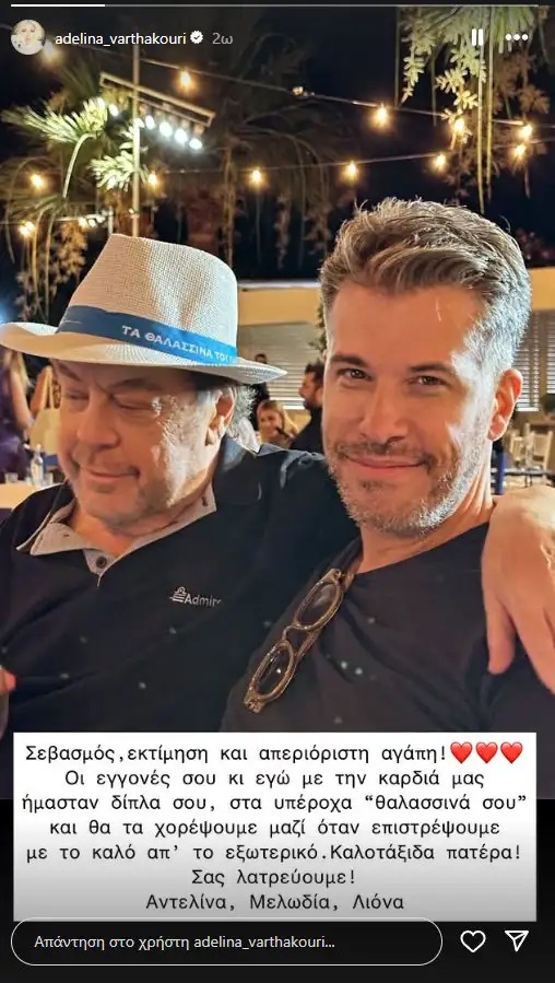 «Σεβασμός, εκτίμηση και απεριόριστη αγάπη! Οι εγγονές σου κι εγώ με την καρδιά μας ήμασταν δίπλα σου, στα υπέροχα “θαλασσινά” σου και θα τα χορέψουμε μαζί όταν επιστρέψουμε με το καλό απ’ το εξωτερικό. Καλοτάξιδα πατέρα. Σας λατρεύουμε! Αντελίνα, Μελωδία, Λιόνα», είχε γράψει η Αντελίνα Βαρθακούρη στην ανάρτησή της.