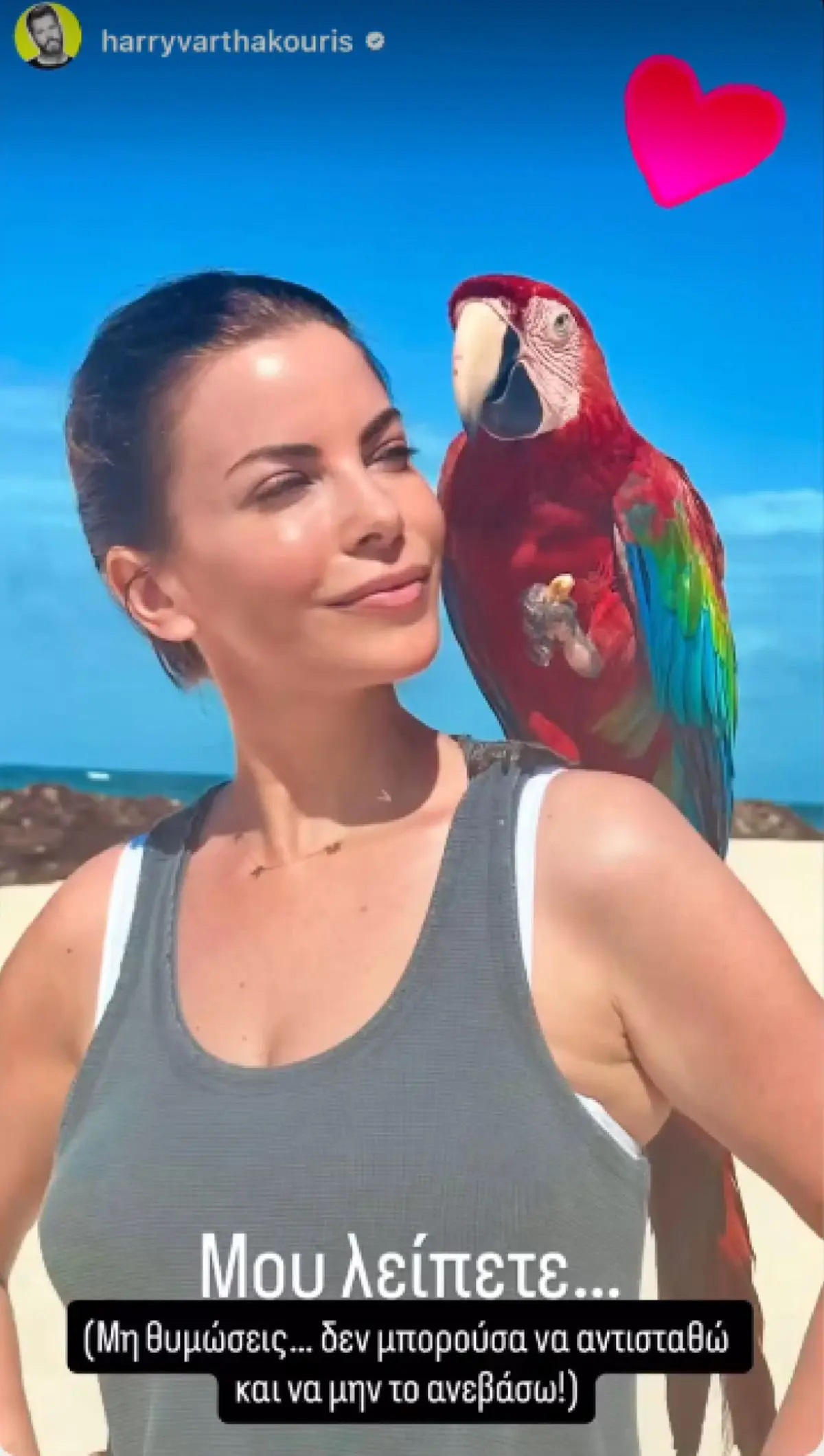 O Χάρης Βαρθακούρης με ανάρτησή του στον προσωπικό του λογαριασμό στο Facebook δείχνει πόσο του λείπουν η σύζυγός του και οι κόρες του, Συγκεκριμένα ο τραγουδιστής ανέβασε μια φωτογραφία με την Αντελίνα Βαρθακούρη από τις διακοπές της και έναν… παπαγάλο, με το ομώνυμο τραγούδι του Λευτέρη Πανταζή και έγραψε στη λεζάντα: «Μου λείπετε… Μη θυμώσεις. Δεν μπορούσα να αντισταθώ και να μην το ανεβάσω».