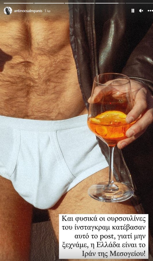 Αυτό συνέβη και με μια φωτογραφία που δημοσίευσε πρόσφατα ο ηθοποιός, στην οποία ποζάρει μόνο με το εσώρουχό του. Ο Αντίνοος Αλμπάνης αναδημοσίευσε την επίμαχη φωτογραφία στα stories του και ξέσπασε γράφοντας: