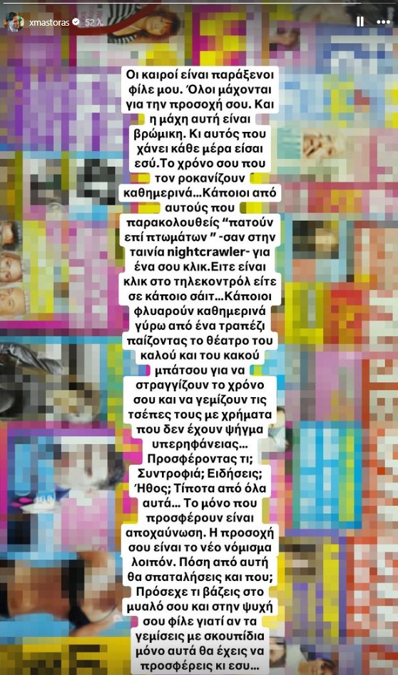 Προσφέροντας τι; Συντροφιά; Ειδήσεις; Ήθος; Τίποτα από όλα αυτά. Το μόνο που προσφέρουν είναι αποχαύνωση. Η προσοχή σου είναι το νέο νόμισμα λοιπόν. Πόση από αυτή θα σπαταλήσεις και πού; Πρόσεχε τι βάζεις στο μυαλό και στη ψυχή σου φίλε γιατί αν τα γεμίσεις με σκουπίδια μόνο αυτά θα έχεις να προσφέρεις και εσύ…», έγραψε ο Χρήστος Μάστορας στην ανάρτησή του.