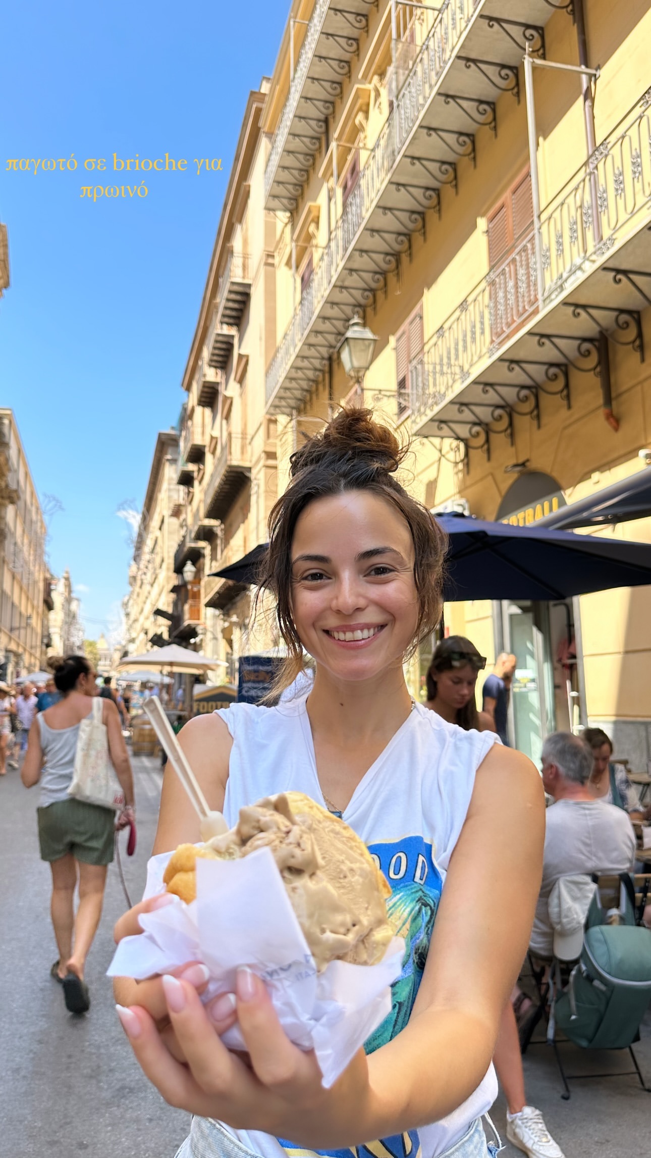 Την επόμενη ημέρα η Σίσσυ Τουμάση και ο Αργύρης Πανταζάρας ανάρτησαν νέες φωτογραφίες από το ταξίδι τους, γράφοντας: «Road trip 2η ημέρα. Σικελία. Χρωματιστές ομπρέλες, τιρκουάζ νερά, arancini, εννοείται παγωτό μέσα σε brioche και κτίρια σαν φτιαγμένα από άμμο παγωμένα στο χρόνο». Και σε αυτά τα στιγμιότυπα, όπως θα δείτε, το φαγητό είχε την τιμητική του.
