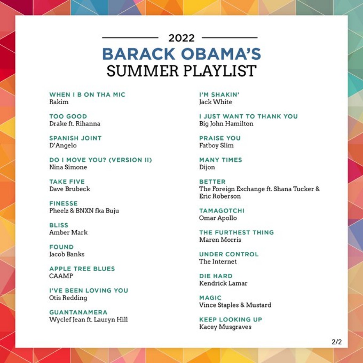 Ξεκινώντας από την κορυφή με το νέο single της Beyonce «Break my Soul», o Obama έδειξε επίσης την αγάπη του στον Harry Styles και το τελευταίο του άλμπουμ, προσθέτοντας μεταξύ άλλων τα «Last Last» των Burna Boy’s, «Mighty Love» από The Spinners», «Persuasive» των Doechii και «Feelin Alright» του Joe Cocker.