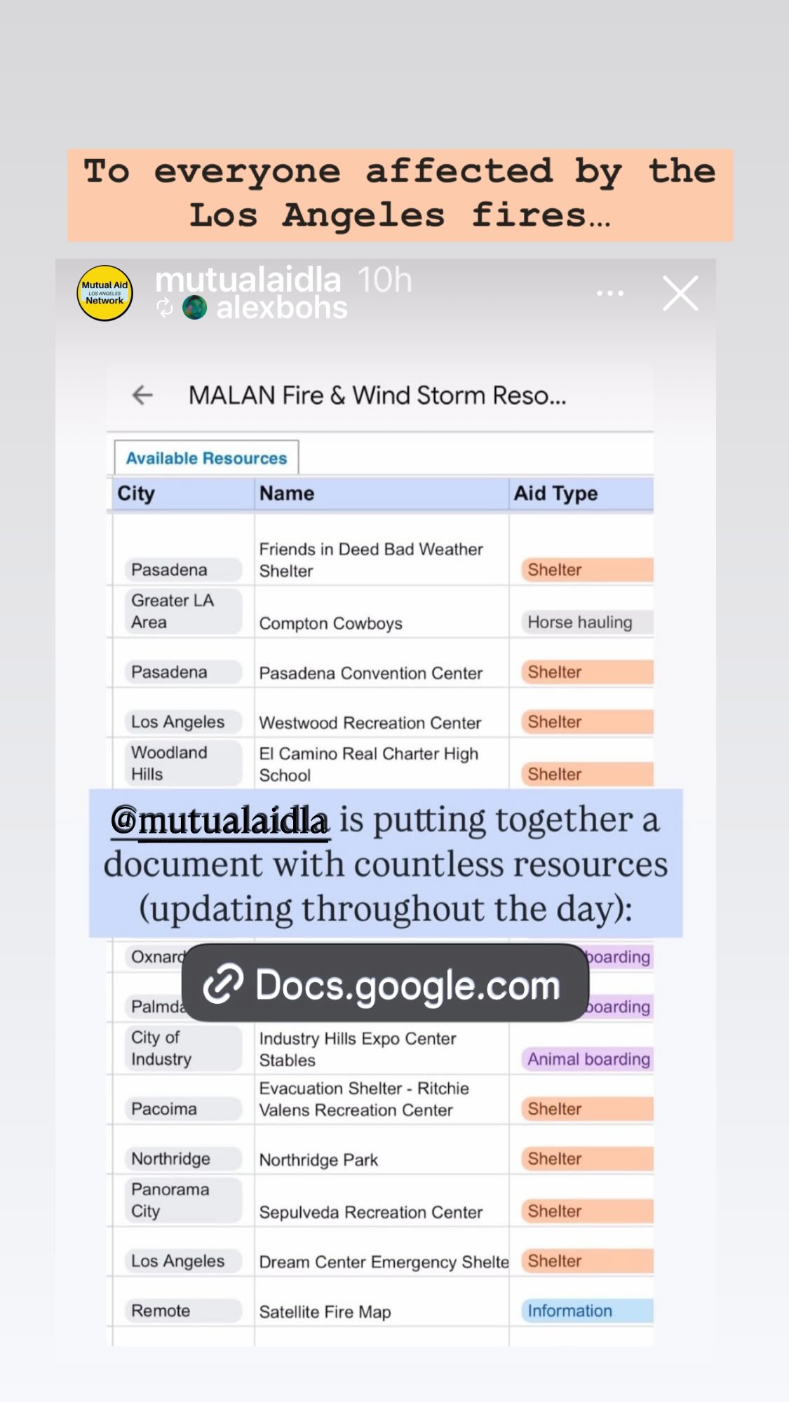 Η δεύτερη διαφάνεια έδειχνε περισσότερο από το έγγραφο, με την Blake να προσθέτει: «Η MALAN ενημερώνει τακτικά αυτό το φύλλο Google με πόρους αμοιβαίας βοήθειας για τους ανθρώπους στο Λος Άντζελες. Υπάρχουν πληροφορίες για καταφύγια, δωρεάν PPE (εξοπλισμός ατομικής προστασίας), τρόφιμα, διασώσεις ζώων και πολλά άλλα. Εάν έχετε πρόσθετους πόρους, παρακαλούμε μοιραστείτε τους με το @mutualaidla».