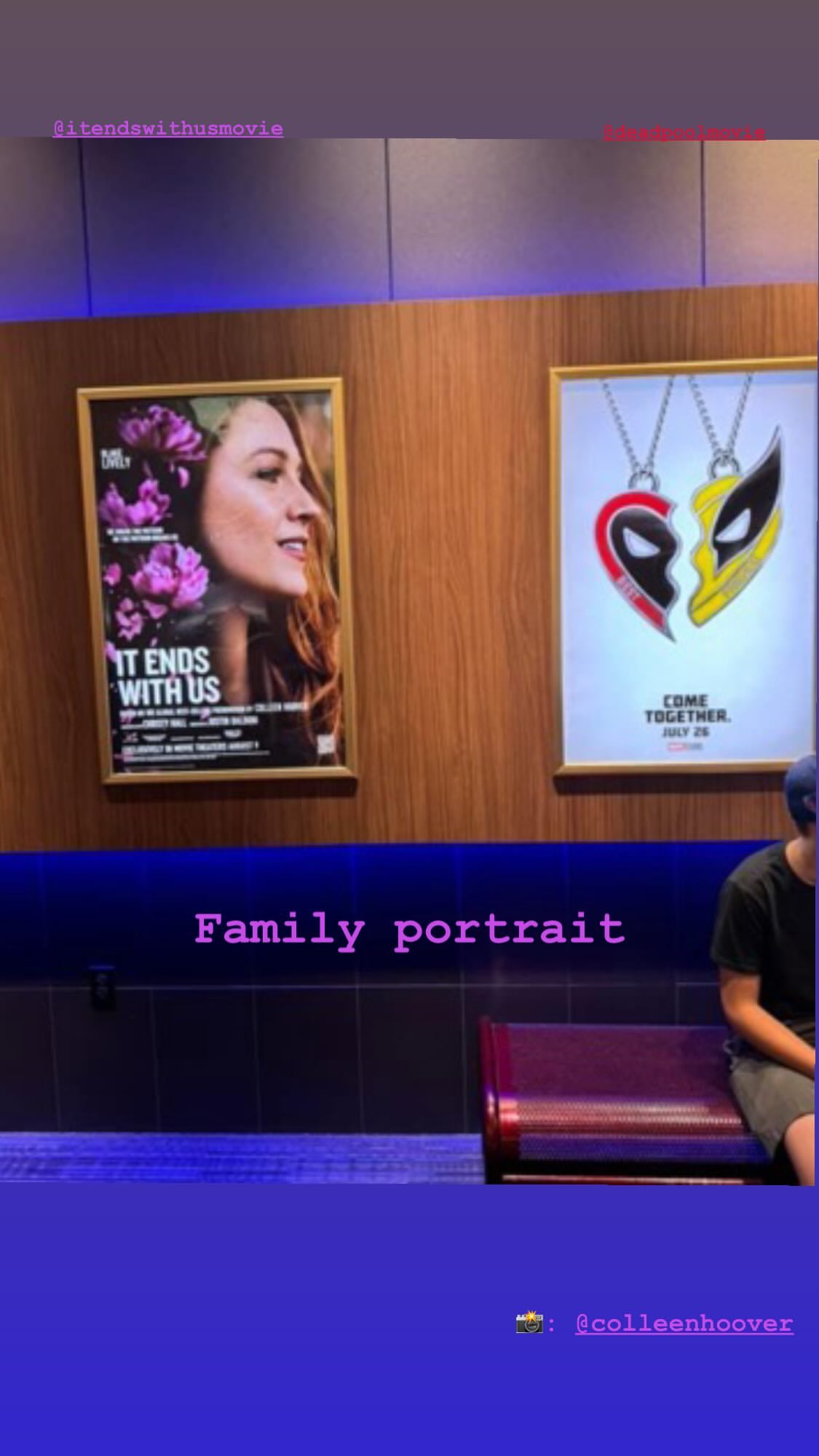 Η ανάρτηση της Lively, η οποία ήταν μια φωτογραφία που τράβηξε η συγγραφέας του It Ends with Us Colleen Hoover, περιλάμβανε αφίσες από την ταινία της και την τελευταία ταινία του Deadpool του Reynolds ακριβώς δίπλα η μία στην άλλη σε μια άγνωστη κινηματογραφική αίθουσα.