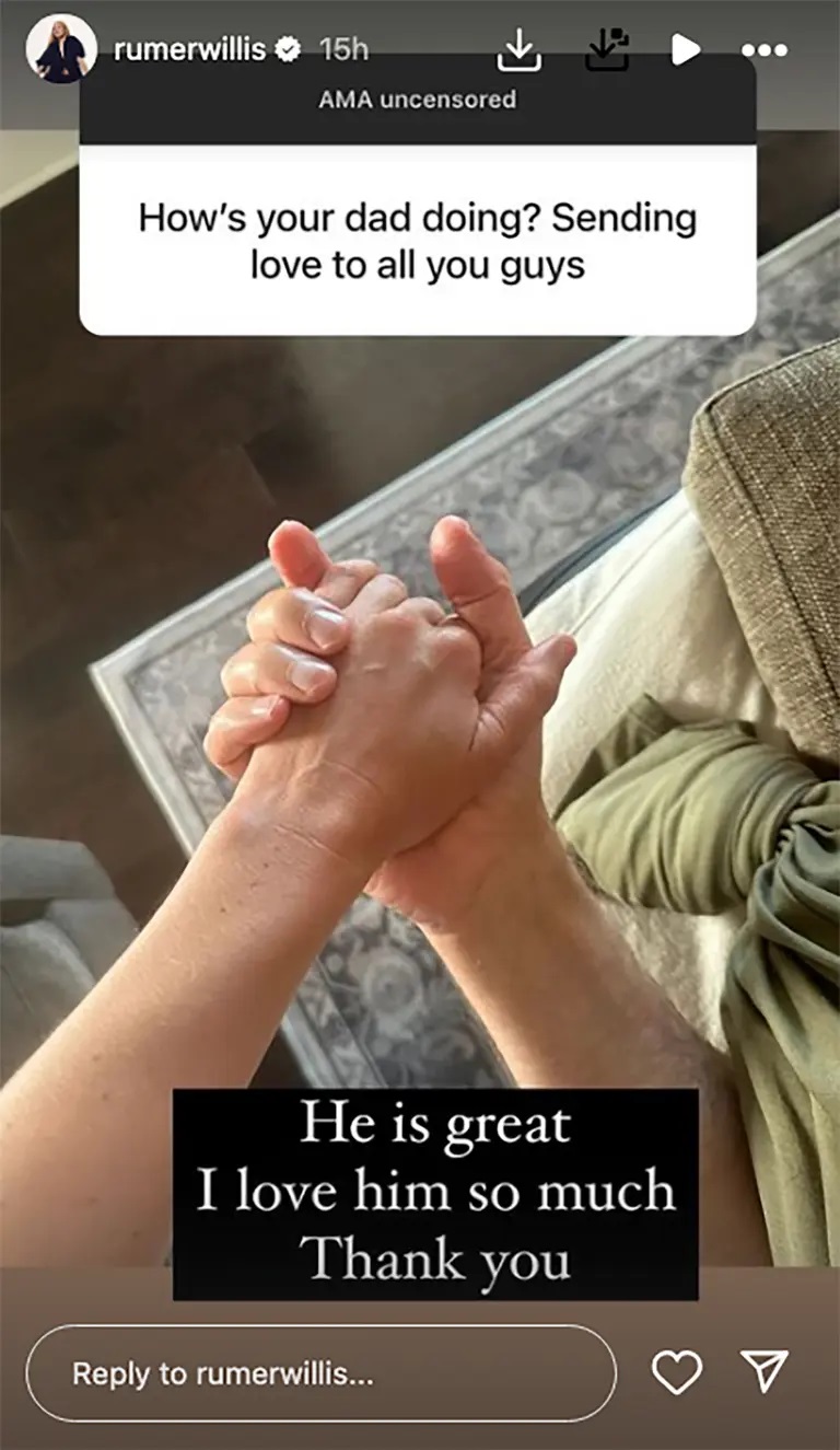 «Είναι υπέροχα», έγραψε στο Instagram Story της στο πλαίσιο ερωταπαντήσεων με θαυμαστές. Και πρόσθεσε: «Τον αγαπώ τόσο πολύ. Σας ευχαριστώ». Η ηθοποιός μοιράστηκε την ενημέρωση πάνω από μια φωτογραφία της που τη δείχνει να κρατάει το χέρι του Bruce, 69 ετών.
