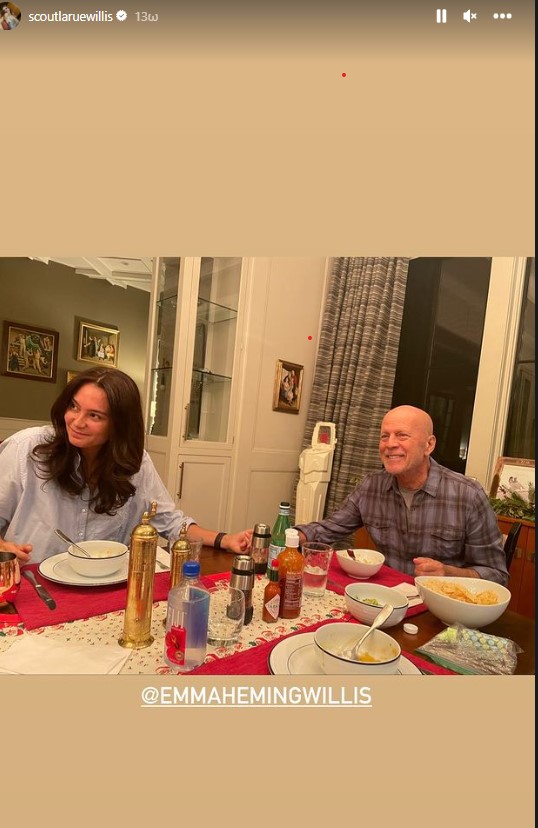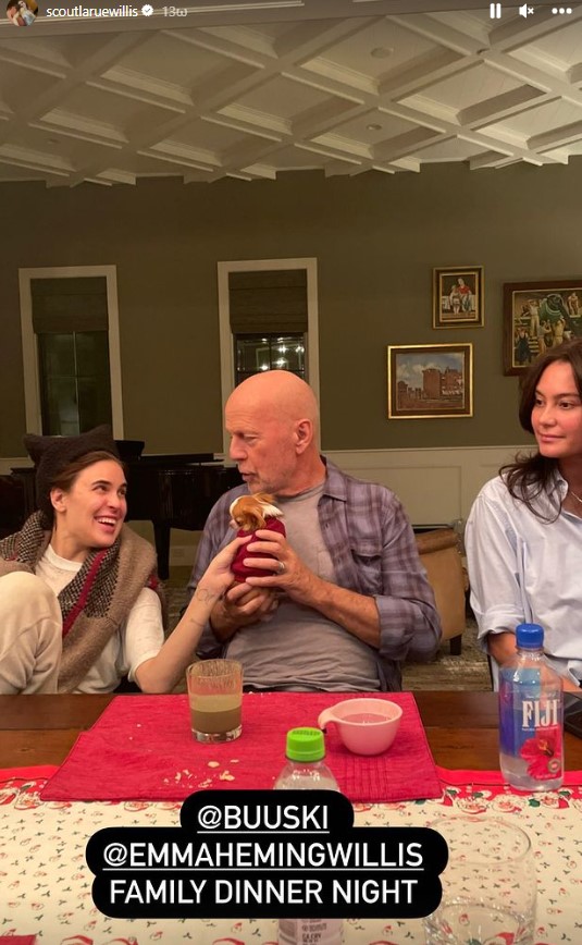 Η κόρη του από τον γάμο του με τη Demi Moore, Tallulah Willis επισκέφθηκε το σπίτι του πατέρα της, όπου διαμένει με τη σύζυγό του Emma Heming Willis και τις κόρες τους Evelyn Penn and Mabel Ray. Η Tallulah τράβηξε δύο φωτογραφίες από την ώρα του οικογενειακού γεύματος τις οποίες ανέβασε στον προσωπικό της λογαριασμό στο Instagram, η αδελφή της Scout LaRue Willis.