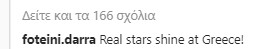 Όπως ήταν φυσικό τα likes και τα σχόλια έπεσαν “βροχή” από τους διαδικτυακούς της φίλους. Ανάμεσα σε αυτούς που έγραψαν κάτω από την ανάρτησή της, είναι και η τραγουδίστρια Φωτεινή Δάρρα που έκανε το ακόλουθο σχόλιο: