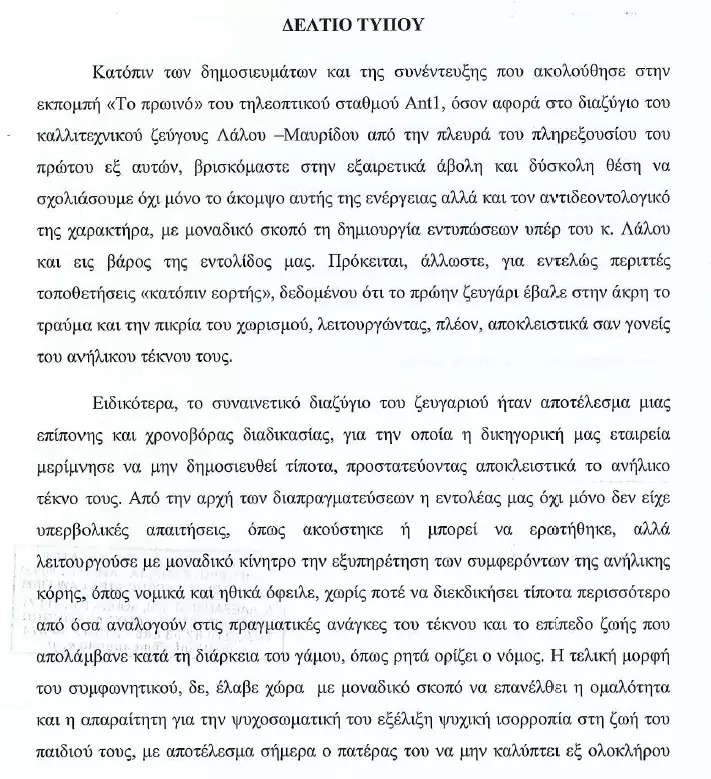 Κατόπιν των δημοσιευμάτων και της συνέντευξης που ακολούθησε στην εκπομπή «Το πρωινό» του τηλεοπτικού σταθμού Ant1, όσον αφορά στο διαζύγιο του καλλιτεχνικού ζεύγους Λάλου -Μαυρίδου από την πλευρά του πληρεξουσίου του πρώτου εξ αυτών, βρισκόμαστε στην εξαιρετικά άβολη και δύσκολη θέση να σχολιάσουμε όχι μόνο το άκομψο αυτής της ενέργειας αλλά και τον αντιδεοντολογικό της χαρακτήρα, με μοναδικό σκοπό τη δημιουργία εντυπώσεων υπέρ του κ. Λάλου και εις βάρος της εντολίδος μας.