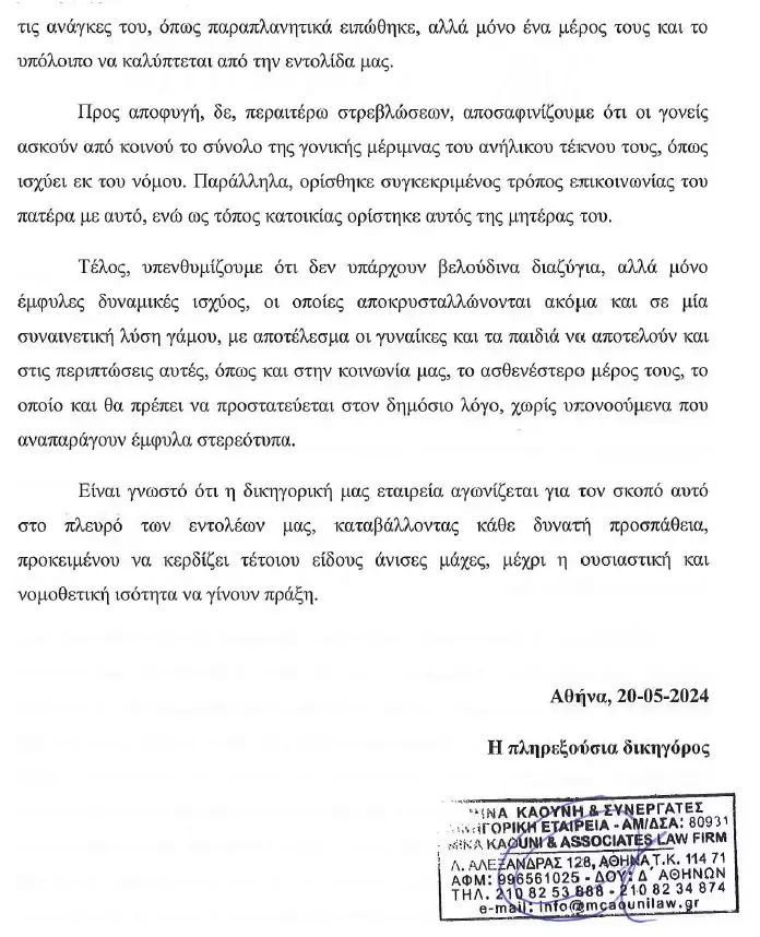 Προς αποφυγή, δε, περαιτέρω στρεβλώσεων, αποσαφηνίζουμε ότι οι γονείς ασκούν από κοινού το σύνολο της γονικής μέριμνας του ανήλικου τέκνου τους, όπως ισχύει εκ του νόμου. Παράλληλα, ορίσθηκε συγκεκριμένος τρόπος επικοινωνίας του πατέρα με αυτό, ενώ ως τόπος κατοικίας ορίστηκε αυτός της μητέρας του.