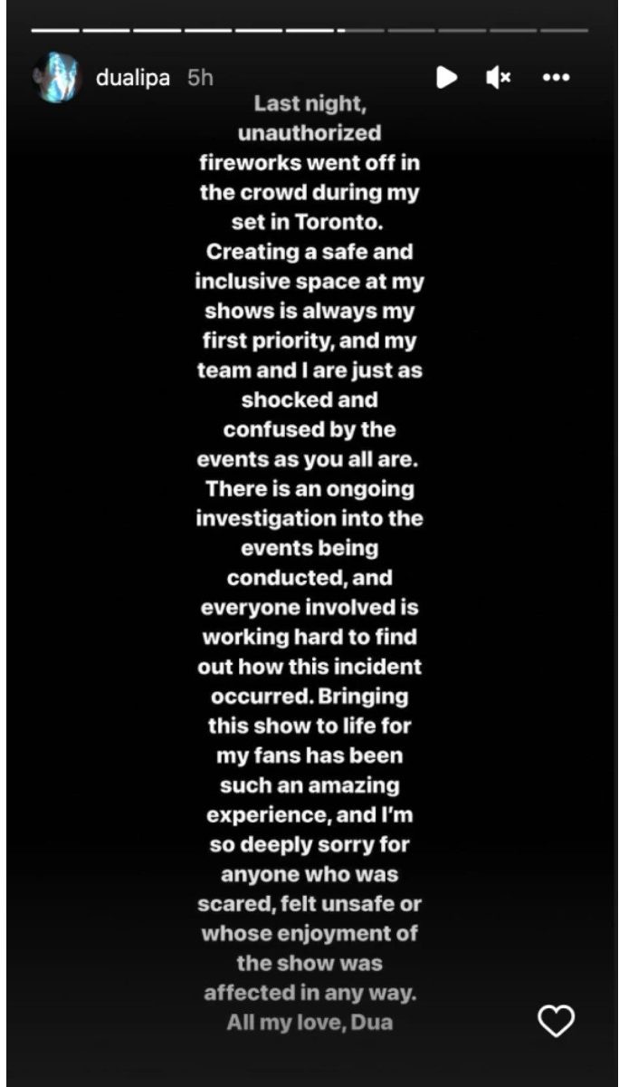 «Λυπάμαι τόσο βαθιά για όποιον φοβήθηκε, ένιωσε ανασφαλής ή του οποίου η απόλαυση του show επηρεάστηκε με οποιονδήποτε τρόπο. Η δημιουργία ενός ασφαλούς και χωρίς αποκλεισμούς χώρου στις παραστάσεις μου είναι πάντα η πρώτη μου προτεραιότητα», είχε αναφέρει σε story της στο Instagram η Dua.