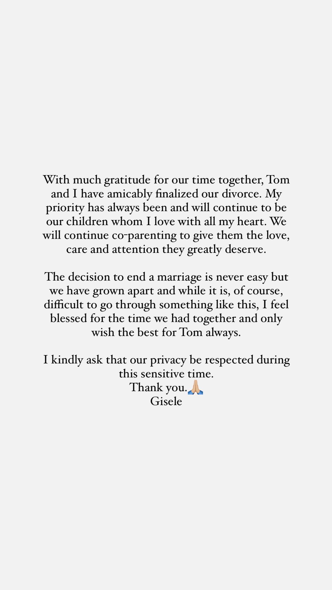 Σε έναν καλυμμένο υπαινιγμό προς τον εν διαστάσει σύζυγό της η Gisele σημείωσε: “Προτεραιότητά μου ήταν και θα συνεχίσει να είναι τα παιδιά μας που αγαπώ με όλη μου την καρδιά”. Στη δήλωσή της η Gisele τονίζει ότι εύχεται τα καλύτερα στον Τom ενώ επισημαίνει ότι παρά το γεγονός ότι η απόφαση για διαζύγιο είναι δύσκολη, ωστόσο, οι δυο τους είχαν απομακρυνθεί.