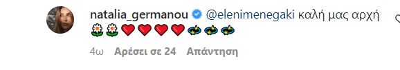 Η Ελένη Μενεγάκη και η Ναταλία Γερμανού είχαν έναν δημόσιο διάλογο στο Instagram. Αφορμή στάθηκε η ανάρτηση που έκανε η Ελένη Μενεγάκη σχετικά με τα βιβλία που της κράτησαν συντροφιά αυτό το καλοκαίρι. Η Ναταλία Γερμανού σχολίασε κάτω από την ανάρτηση προτείνοντας ένα βιβλίο στη συνάδελφό της.