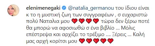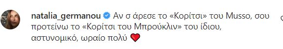 “Αν σου άρεσε το “Κορίτσι του Μusso” σου προτείνω το “Κορίτσι του Μπρούκλιν” του ίδιου, αστυνομικό, ωραίο πολύ» έγραψε η Ναταλία Γερμανού με την Ελένη Μενεγάκη να της απαντά: