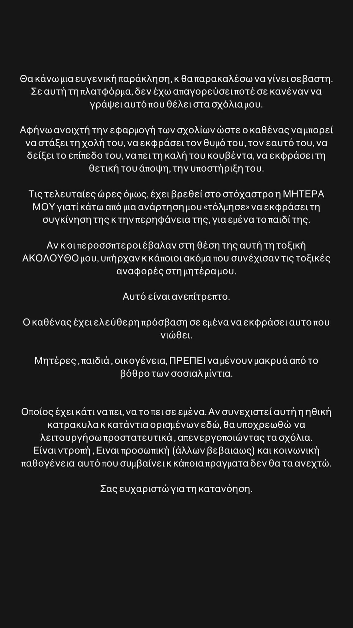 «Θα κάνω μια ευγενική παράκληση, και θα παρακαλέσω να γίνει σεβαστή. Σε αυτή τη πλατφόρμα, δεν έχω απαγορεύσει ποτέ σε κανέναν να γράψει αυτό που θέλει στα σχόλιά μου.