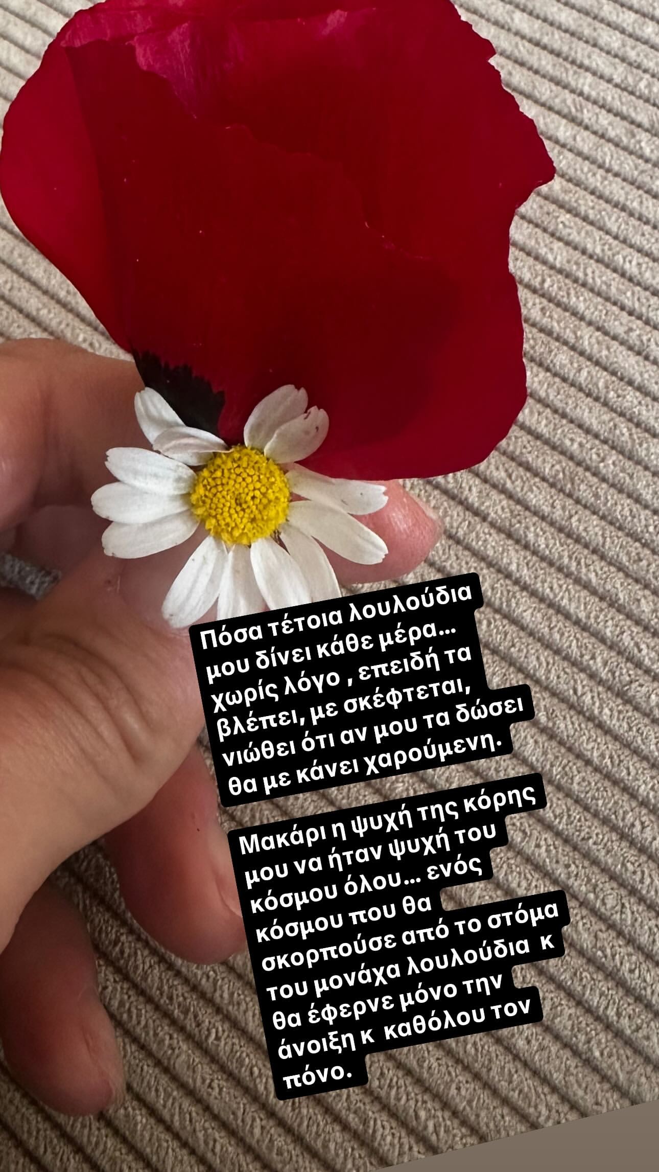 «Πόσα τέτοια λουλούδια μου δίνει κάθε μέρα χωρίς λόγο, επειδή τα βλέπει, με σκέφτεται, νιώθει ότι αν μου τα δώσει θα με κάνει χαρούμενη. Μακάρι η ψυχή της κόρης μου, να ήταν η ψυχή του κόσμου όλου… Ενός κόσμου που θα σκορπούσε από το στόμα του μονάχα λουλούδια και θα έφερνε μόνο την άνοιξη και καθόλου τον πόνο», έγραψε η Ελεονώρα Μελέτη στην φωτογραφία που μοιράστηκε με τους διαδικτυακούς της φίλους στο Instagram.