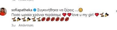 Πόσο ωραία χρόνια περάσαμε ❤️❤️love u my girl¨, σχολίασε η Σοφία Παθέκα κάτω από την ανάρτηση της κουμπάρας της.
