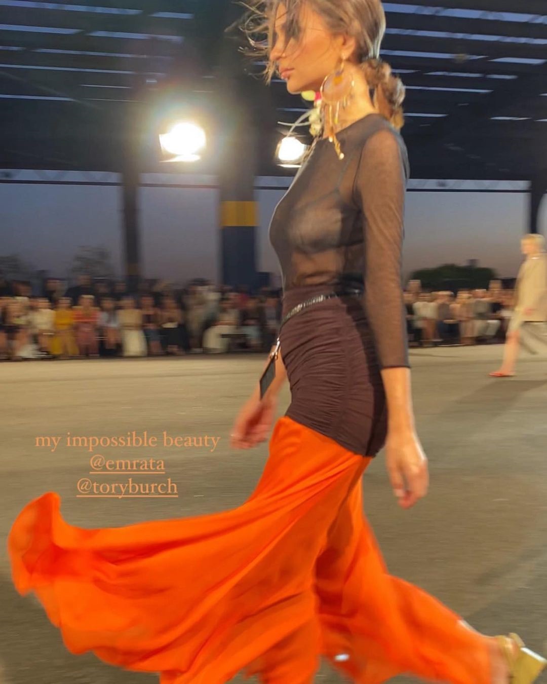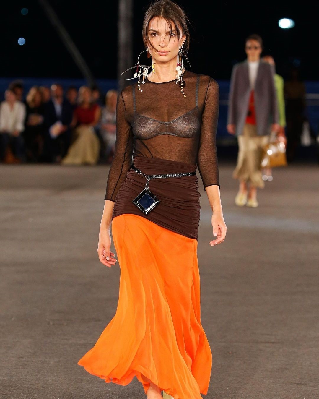 Το γνωστό μοντέλο περπάτησε στην πασαρέλα και με την εμφάνισή της άφησε ελάχιστα στη φαντασία. Συγκεκριμένα περπάτησε στην πασαρέλα φορώντας μια μαύρη διάφανη μπλούζα και από μέσα ένα επίσης διάφανο σουτιέν αφήνοντας ακάλυπτο το στήθος της. Το σύνολο συνόδευε μία μακριά αέρινη φούστα σε έντονο πορτοκαλί χρώμα, ενώ τα μαλλιά της ήταν πιασμένα σε χαμηλό ατημέλητο κότσο, και έτσι ξεχώριζαν τα μεγάλα boho σκουλαρίκια της στις αποχρώσεις του κίτρινου. Στο ίδιο χρώμα οι πλατφόρμες ολοκλήρωσαν την εμφάνισή της.