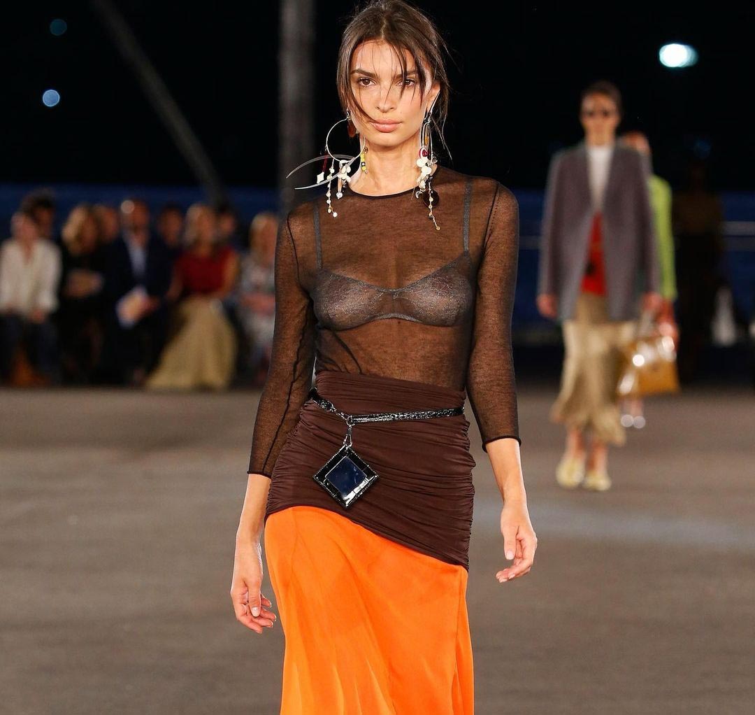 Το γνωστό μοντέλο περπάτησε στην πασαρέλα και με την εμφάνισή της άφησε ελάχιστα στη φαντασία. Συγκεκριμένα περπάτησε στην πασαρέλα φορώντας μια μαύρη διάφανη μπλούζα και από μέσα ένα επίσης διάφανο σουτιέν αφήνοντας ακάλυπτο το στήθος της. Το σύνολο συνόδευε μία μακριά αέρινη φούστα σε έντονο πορτοκαλί χρώμα, ενώ τα μαλλιά της ήταν πιασμένα σε χαμηλό ατημέλητο κότσο, και έτσι ξεχώριζαν τα μεγάλα boho σκουλαρίκια της στις αποχρώσεις του κίτρινου. Στο ίδιο χρώμα οι πλατφόρμες ολοκλήρωσαν την εμφάνισή της.