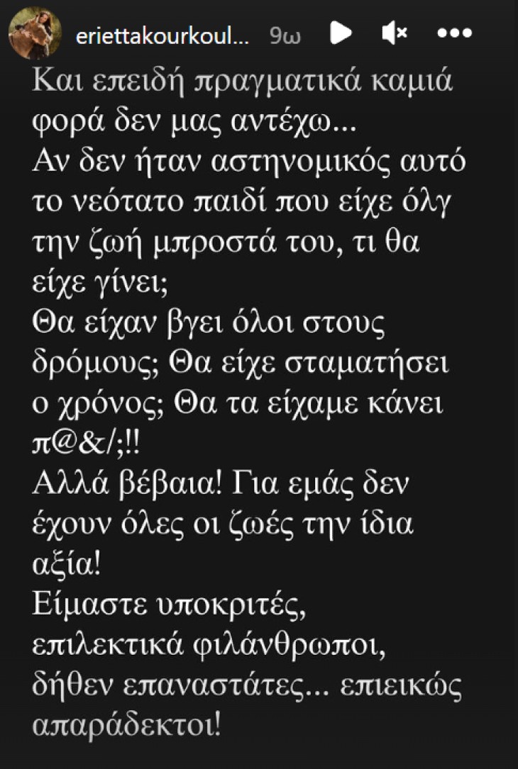 «Και επειδή καμία φορά δεν μας αντέχω… Αν δεν ήταν αστυνομικός αυτό το νεότατο παιδί που είχε όλη τη ζωή μπροστά του, τι θα είχε γίνει; Θα είχαν βγει όλοι στους δρόμους; Θα είχε σταματήσει ο χρόνος; Θα τα είχαμε κάνει πο###; Αλλά βέβαια, για εμάς δεν έχουν όλες οι ζωές την ίδια αξία. Είμαστε υποκριτές, επιλεκτικά φιλάνθρωποι, δήθεν επαναστάτες… επιεικώς απαράδεκτοι» έγραψε η Εριέττα Κούρκουλου.
