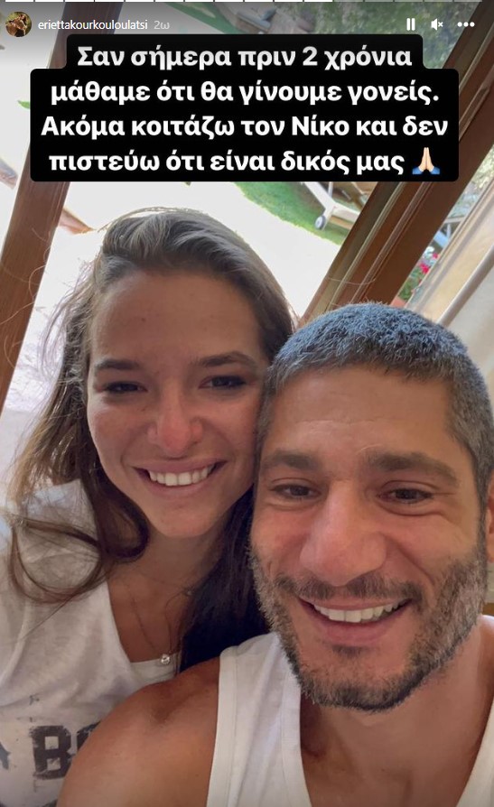 H Εριέττα Κούρκουλου Λάτση εκτός από το συγκινητικό βίντεο, δημοσίευσε και δύο τρυφερά στιγμιότυπα, το ένα με τον σύζυγό της και το άλλο με τον γιο της και έγραψε στη λεζάντα: “Σαν σήμερα πριν 2 χρόνια μάθαμε ότι θα γίνουμε γονείς. Ακόμα κοιτάω τον Νίκο και δεν πιστεύω ότι είναι δικός μας”.