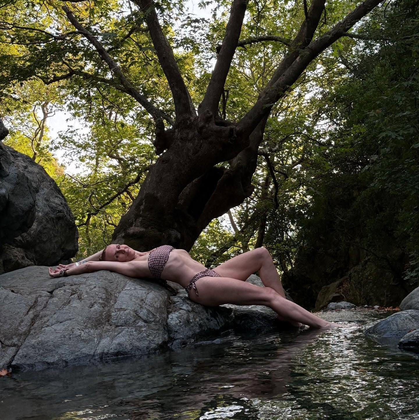 Τέλος, η Εβελίνα Παπούλια δεν θα μπορούσε να μην κολυμπήσει στις διάσημες βάθρες της Σαμοθράκης, μέσα σε ένα άγριο τοπίο φυσικής ομορφιάς, γεμάτο από πλατάνια και πεύκα.