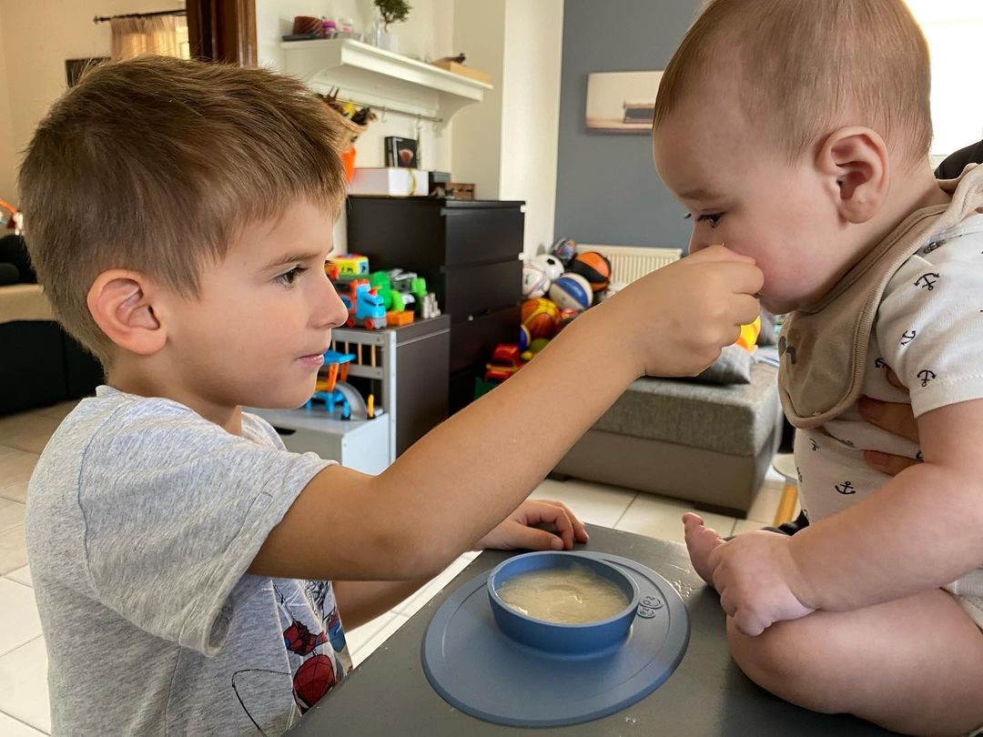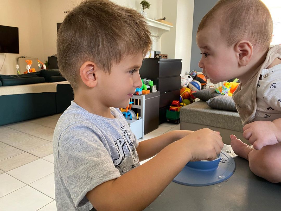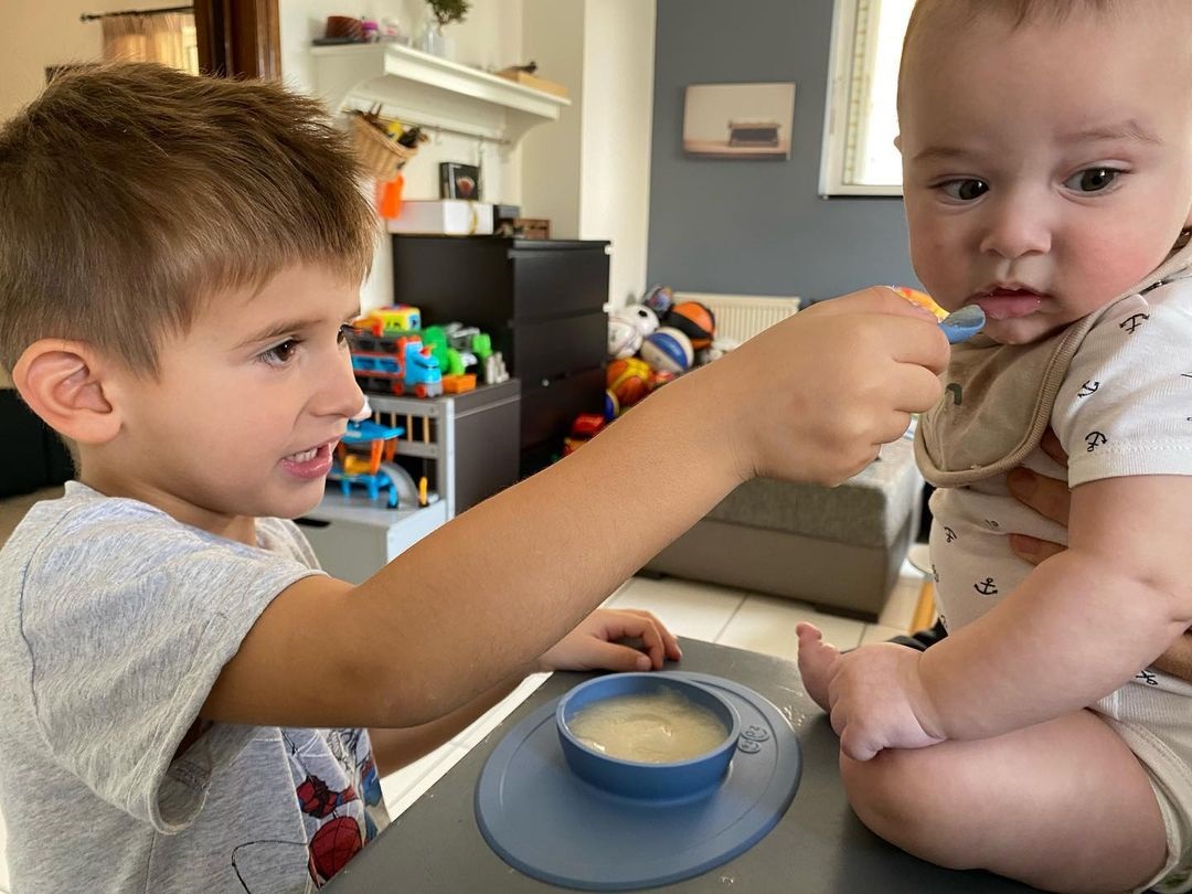 Μαμά σε παλακαλώ θέλω εγώ να τον ταΐζω, μόνο εγώ!!! Το πρώτο μας φαγητό με την πιο μεγάλη τρυφερότητα! Από τον μεγάλο αδερφό. Εγώ πάντως συγκινήθηκα“, έγραψε η Φωτεινή Αθερίδου στη λεζάντα της ανάρτησής της.