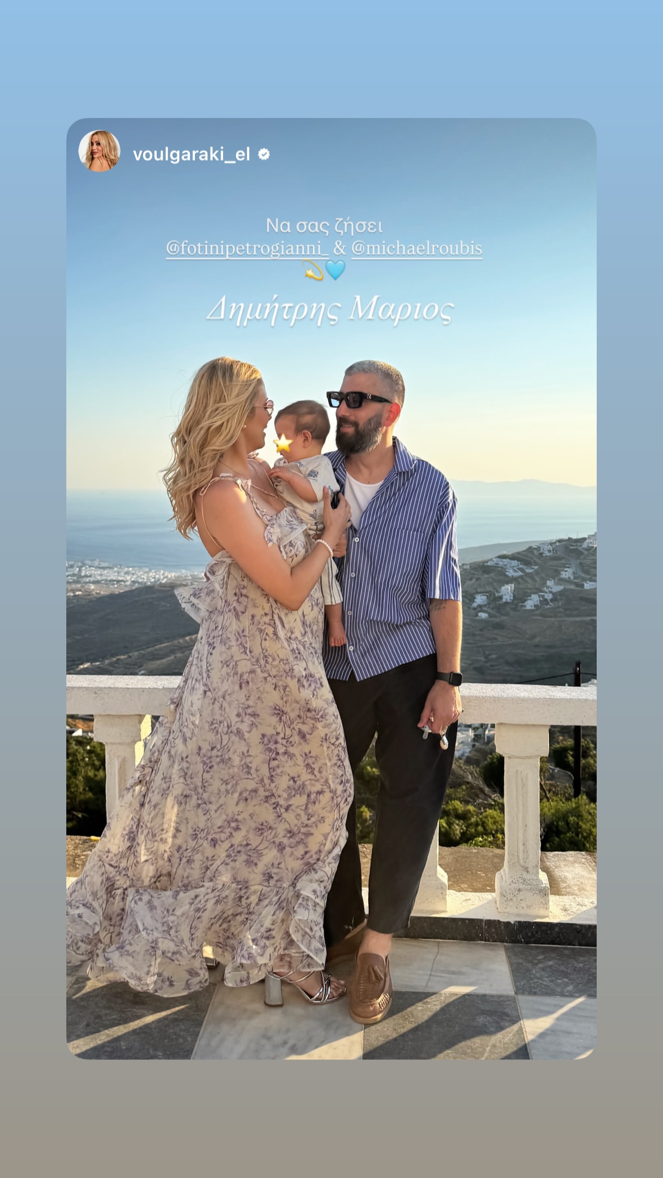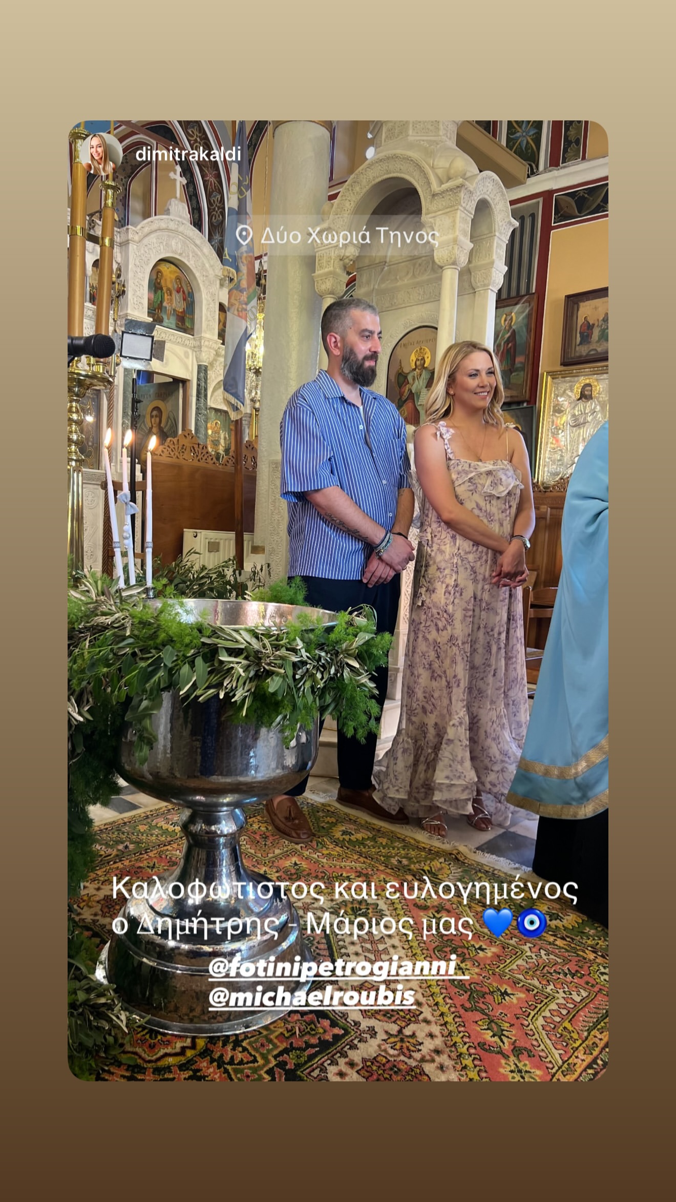 Μία από τις πιο όμορφες και σημαντικές ημέρες της ζωής της έζησε χθες, Σάββατο 19 Ιουλίου, η Φωτεινή Πετρογιάννη και ο σύζυγός της, Μιχάλης Ρουμπής, καθώς βάφτισαν τον γιο τους στην Τήνο.