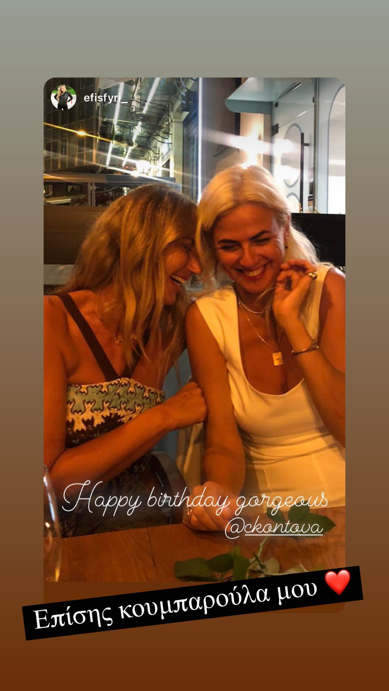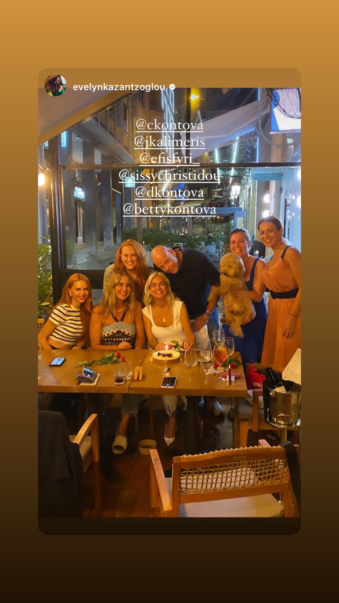 Αργότερα το βράδυ οι καλοί της φίλοι της οργάνωσαν μία μικρή συγκέντρωση σε γνωστό μαγαζί της Αθήνας, όπου η σχεδιάστρια έσβησε τα κεράκια της τούρτας της.