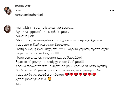 Πόσο σ’ αγαπω σε χαίρομαι και σε θαυμάζω! Είμαι περήφανη που υπάρχεις στη ζωή μου! Χρόνια πολλά πολύτιμε θησαυρέ μου.. χρόνια γεμάτα αγάπη δίπλα στον Μιχαλάκη σου και σε όσους σε αγαπάμε… Να χαμογελάς να φωτίζει ο κόσμος ❤️❤️❤️❤️💖💖💖 χαρούμενα γενέθλια» ανέφερε η ανάρτηση για την Κωνσταντίνα Μπεκιάρη.