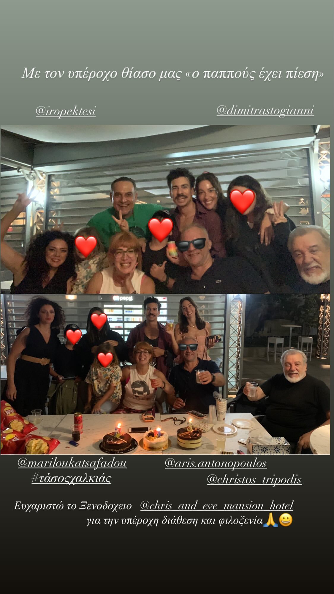 Εκεί, λοιπόν, πάνω στη σκηνή και αργότερα στο ξενοδοχείο που διαμένει ο θίασος, γιόρτασαν όλοι μαζί τη ξεχωριστή αυτή ημέρα του Κρατερού Κατσούλη.