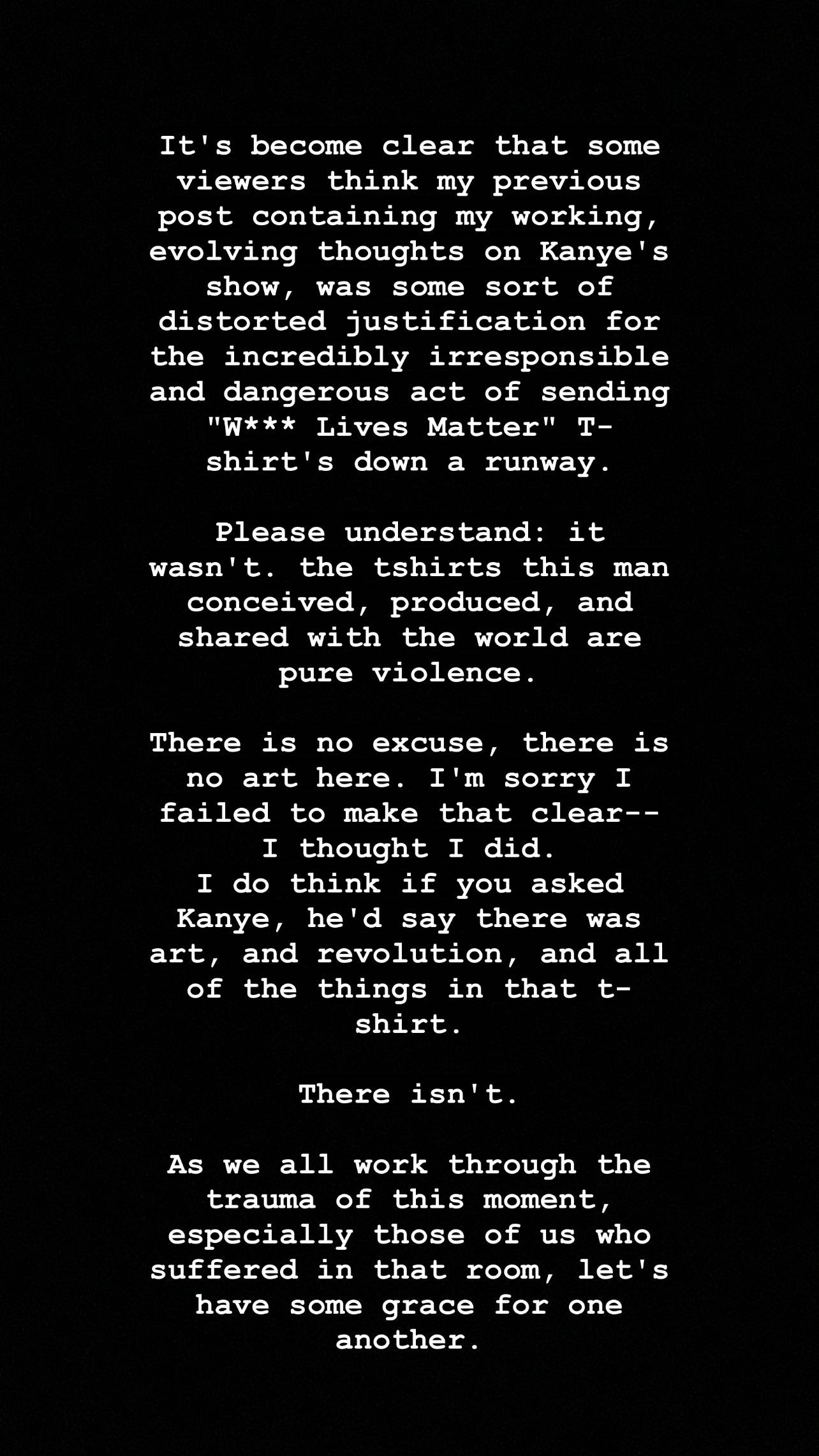 Στη συνέχεια, σε μια σειρά αναρτήσεων, ο Ye επέκρινε την Gabriella Karefa-Johnson, στυλίστρια και συντάκτρια της Vogue, η οποία είχε χαρακτηρίσει το μπλουζάκι του “αδικαιολόγητη συμπεριφορά”.