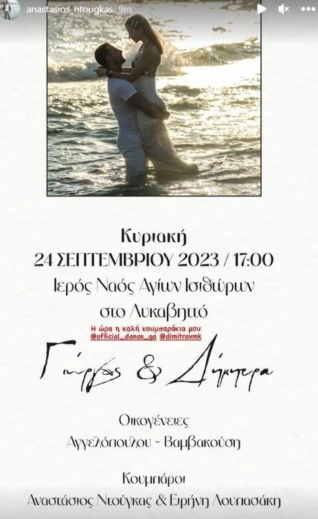 Τη χαρμόσυνη είδηση έκανε γνωστή ο δικηγόρος και κουμπάρος τους Αναστάσιος Ντούγκας. Ο δικηγόρος δημοσίευσε το προσκλητήριο του γάμου στο προσωπικό του προφίλ στο instagram.
