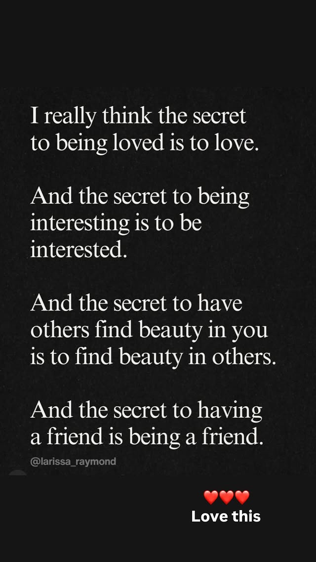«Πραγματικά πιστεύω ότι το μυστικό για να αγαπηθείς είναι να αγαπάς. Και το μυστικό για να είσαι ενδιαφέρων είναι να ενδιαφέρεσαι. Και το μυστικό για να βρίσκουν οι άλλοι την ομορφιά σε σένα είναι να βρίσκεις την ομορφιά στους άλλους. Και το μυστικό για να έχεις έναν φίλο είναι να είσαι φίλος», έγραφε το απόσπασμα, που αποδίδεται στο ψευδώνυμο @larissa_raymond.