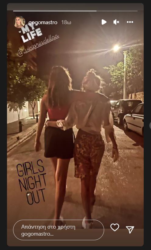 Έτσι, ανέβασε insta story όπου μαμά και κόρη απολαμβάνουν τη βραδινή τους έξοδο. Δείχνουν την πλάτη τους στον φακό και στη λεζάντα η Γωγώ Μαστροκώστα σημειώνει: “Girls night out” και προσθέτει “ζωή μου” κάνοντας tag τη Βικτώρια, η οποία τον Δεέμβριο θα γίνει 14 χρόνων.