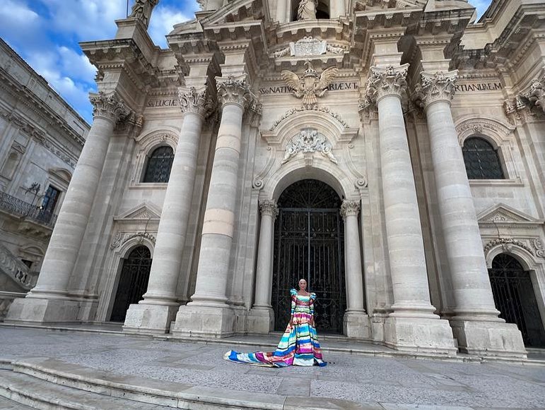 Πολλές διάσημες κυρίες έδωσαν το “παρών” και δεν αντιστάθηκαν να φωτογραφηθούν με φόντο τον επιβλητικό Καθεδρικό Ναό των Συρακουσών.