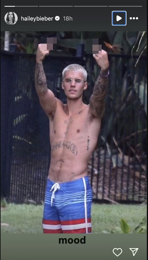 Ο Justin ήταν χωρίς μπλούζα και φορούσε βερμούδα, καθώς η παιχνιδιάρικη φωτογραφία είχε τη λεζάντα «mood» από τη Hailey.