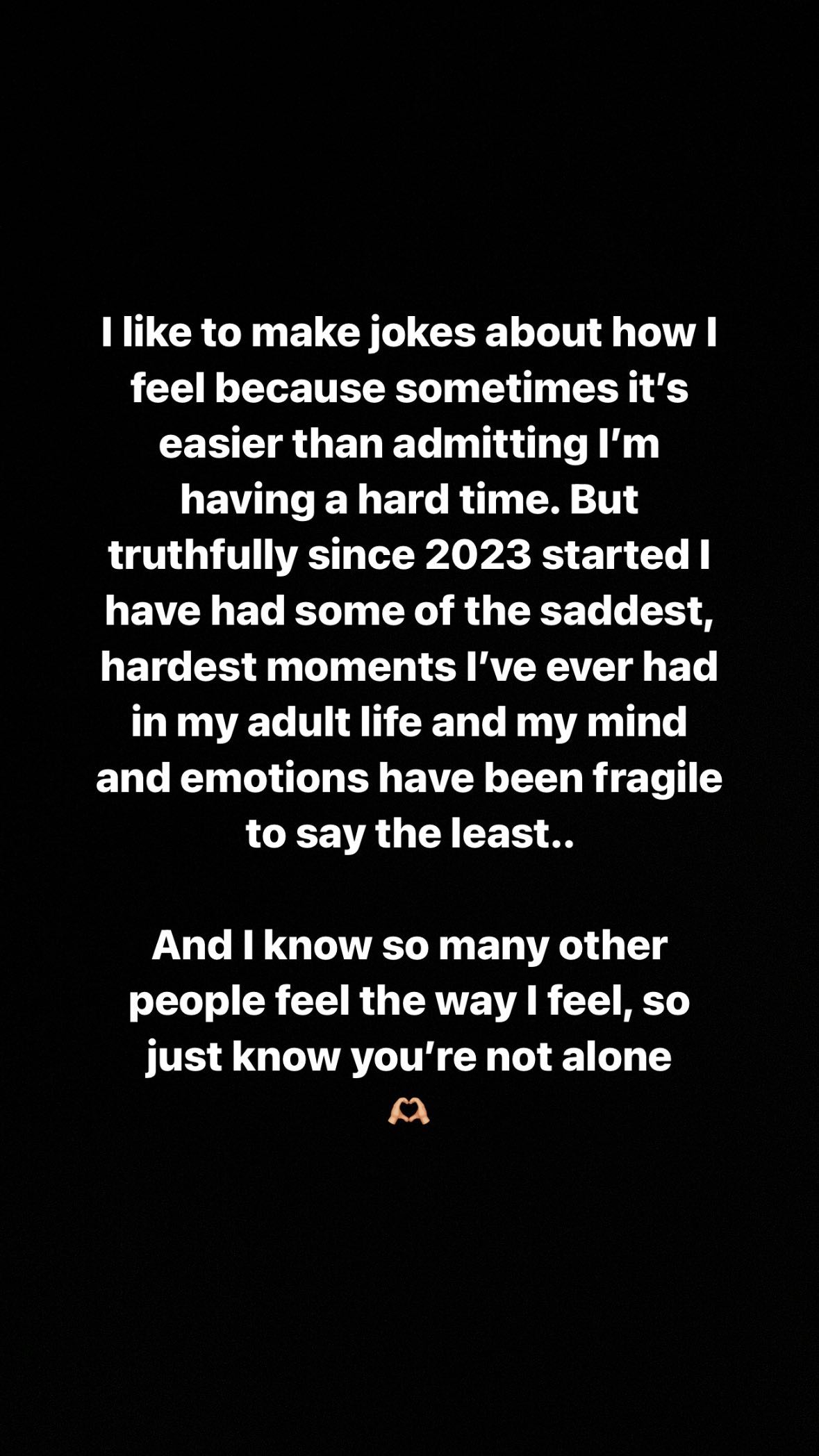 Και συνέχισε: “Αλλά ειλικρινά από τότε που ξεκίνησε το 2023 πέρασα μερικές από τις πιο θλιβερές και δύσκολες στιγμές που είχα ποτέ στην ενήλικη ζωή μου και το μυαλό και τα συναισθήματά μου ήταν τουλάχιστον εύθραυστα.“