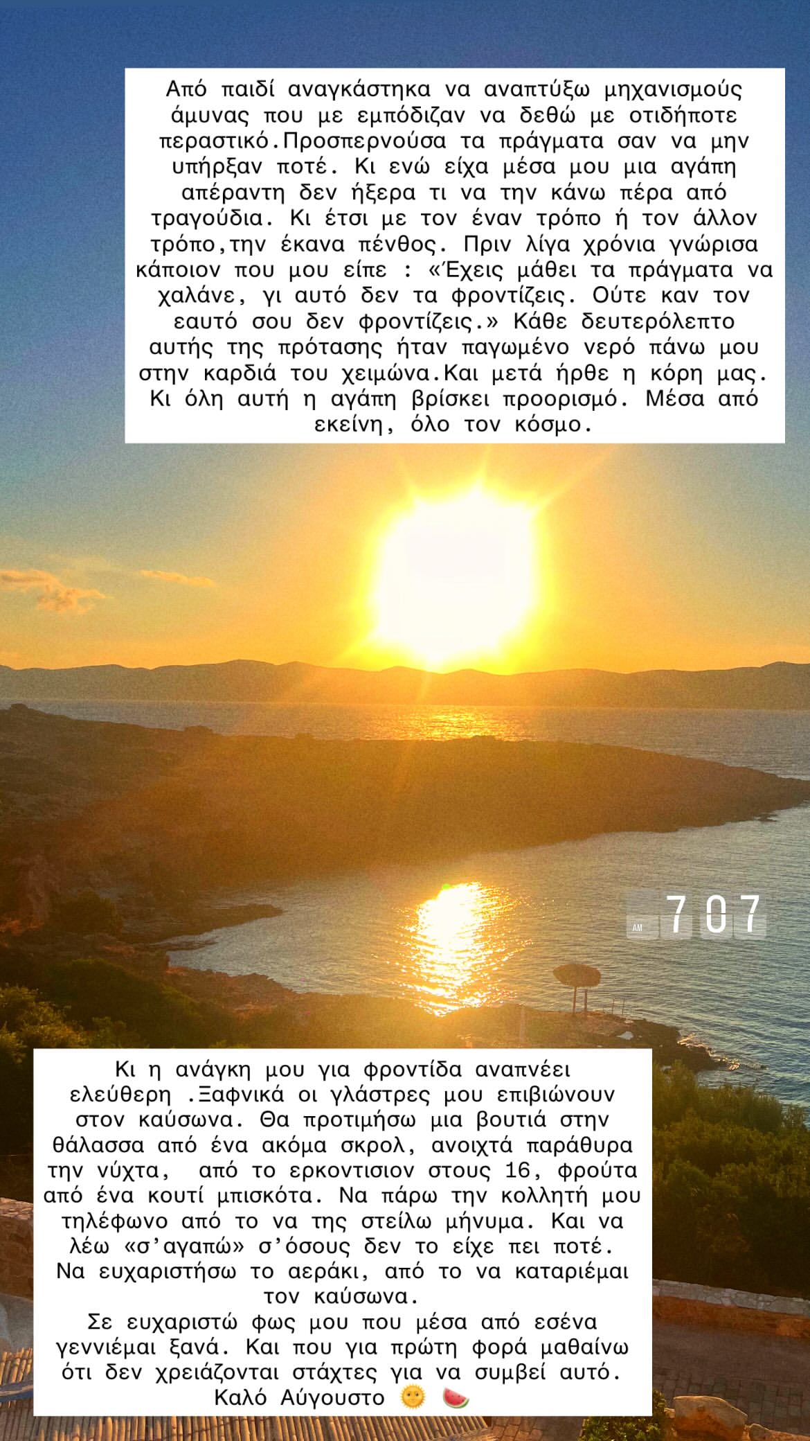 Σε ευχαριστώ φως μου που μέσα από εσένα γεννιέμαι ξανά. Και που για πρώτη φορά μαθαίνω ότι δεν χρειάζονται στάχτες για να συμβεί αυτό. Καλό Αύγουστο».