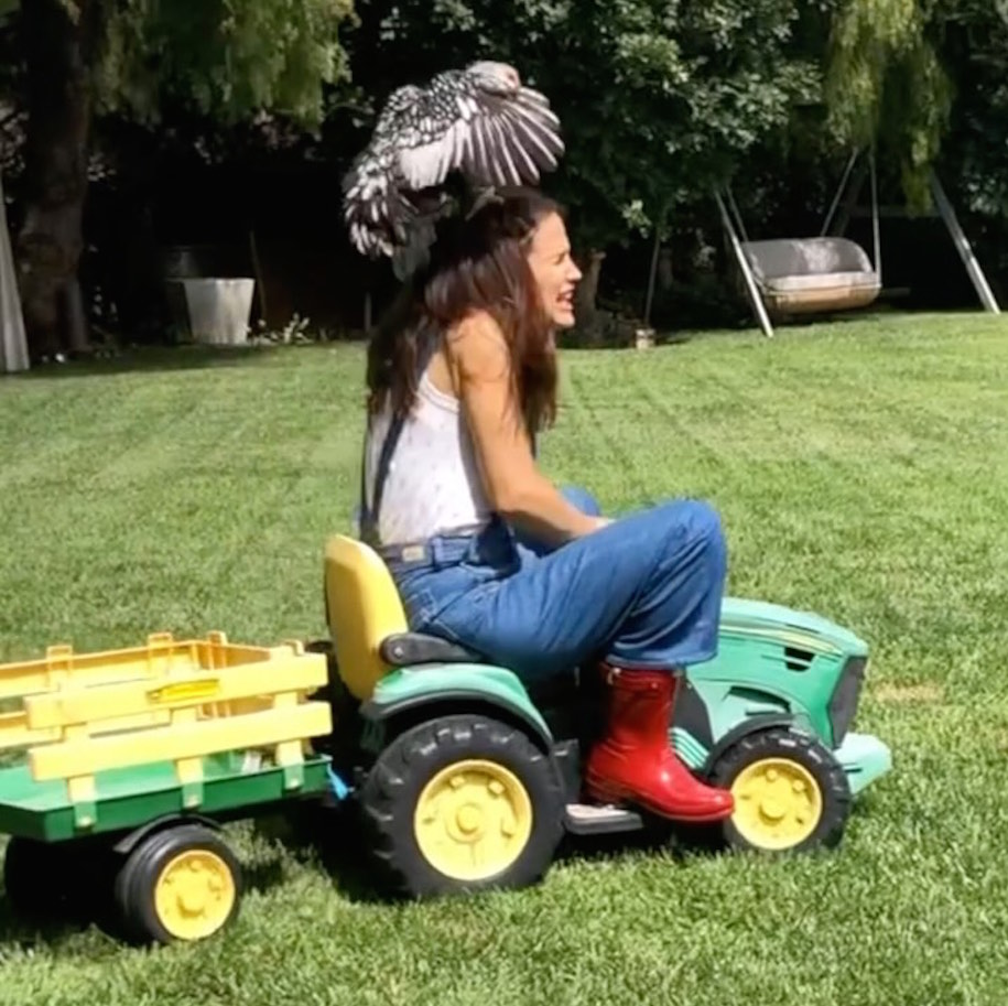 Σε ένα βίντεο που μοιράστηκε, βλέπουμε την ηθοποιό να οδηγεί ένα παιδικό μίνι τρακτέρ φορώντας την τζιν σαλοπέτα της, ενώ στην καρότσα που σέρνει πίσω της κουβαλάει μια κότα, η οποία δεν φαίνεται να συμμερίζεται τον ενθουσιασμό της. Έτσι, καθώς παίρνει μια στροφή, η κότα βουτά πάνω στο κεφάλι της Garner, η οποία πανικοβάλλεται και αρχίζει να φωνάζει.