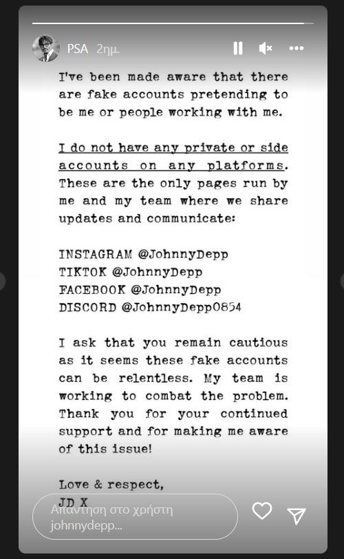 Σε ένα μακροσκελές Instagram Story, που τώρα έχει αρχειοθετηθεί ως Highlight υπό τον τίτλο “PSA”, ο Depp προειδοποιεί: “Ενημερώθηκα ότι υπάρχουν ψεύτικοι λογαριασμοί που προσποιούνται ότι είμαι εγώ ή άνθρωποι που συνεργάζονται μαζί μου.